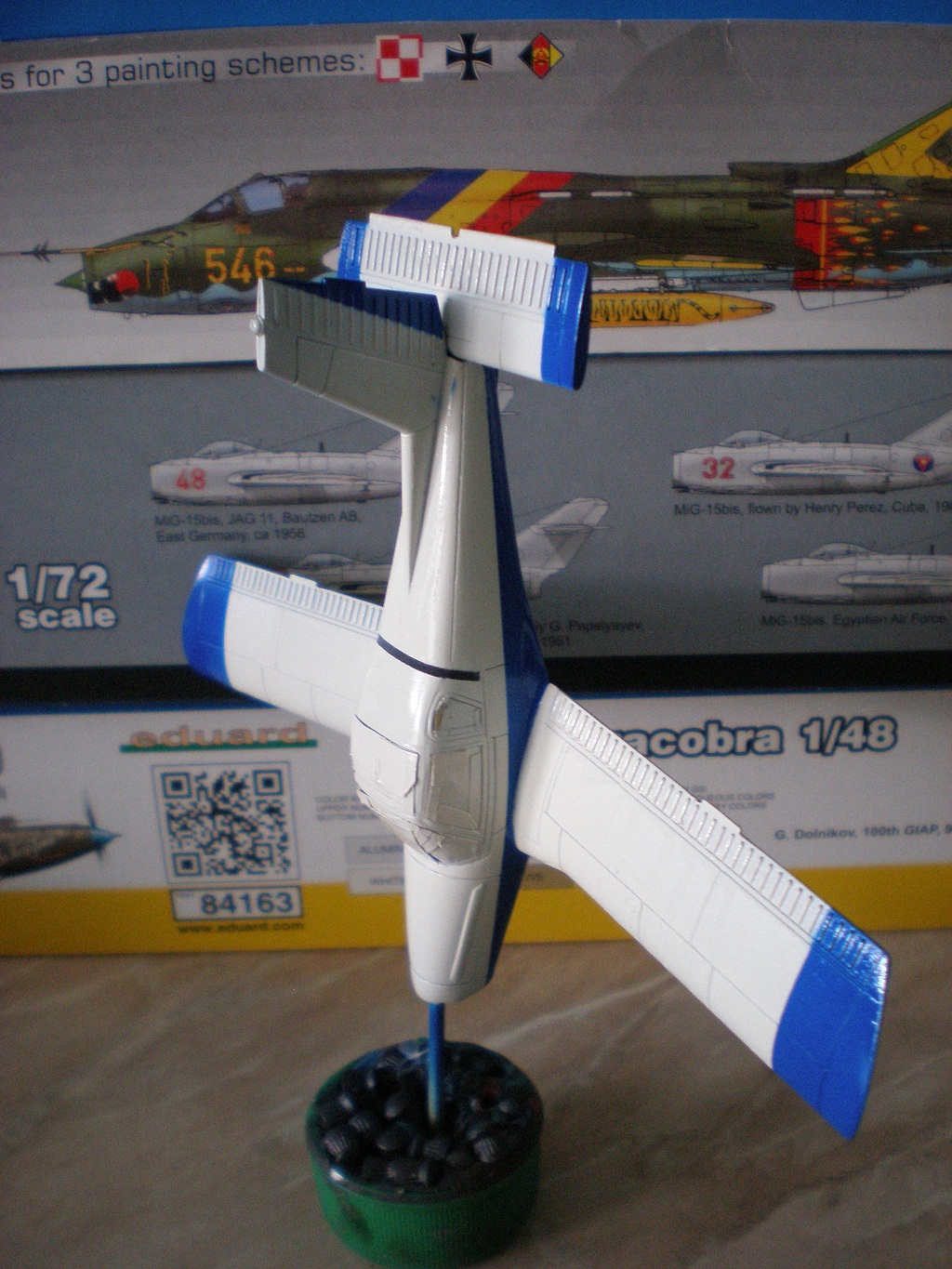 Tak nakoniec si biela dala povedať chcelo to nižší tlak a viac vrstiev. Nastriekal som už aj modrú, žiaľ maskovacia páska mi strhla bielu farbu resp. nechala mi tam také lepivé flaky :( na fotkách to až tak nevidno, ale pri svetle je to dosť viditeľné takže to celé prebrúsim a bielu fúknem znova a zároveň opravím miesta kde som podfúkol modrú. Ale vôbec nechápem prečo mi tam páska nechala tie flaky, nikdy sa mi nič podobné nestalo. Ja ten Zlín asi naučím lietať :evil: :evil: