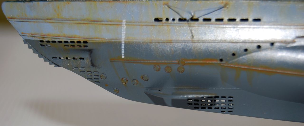 Model Revell (ICM) + lepty od Ottu Geržu. Nie je to model konkrétnej ponorky. Toto je môj prvý model kde som si vo väčšej miere skúsil "opotrebenie". Lepty otvorov som použil jen na na veži (inde som sa ich bál použiť z dôvodu mojej nešikovnosti). použil som Ottovu metódu "umiestnenia pomocou pájkovačky". Napodiv mi to celkom šlo. Na budúcej ponorke (VIIC/41) to skúsim v oveľa väčšej miere