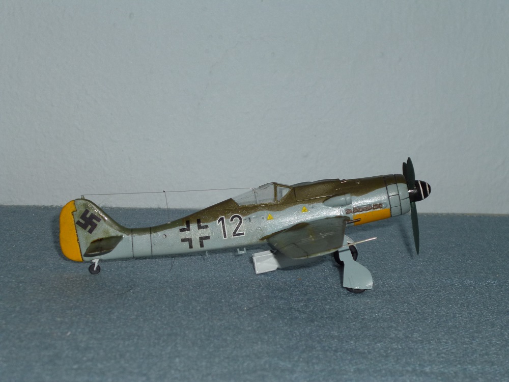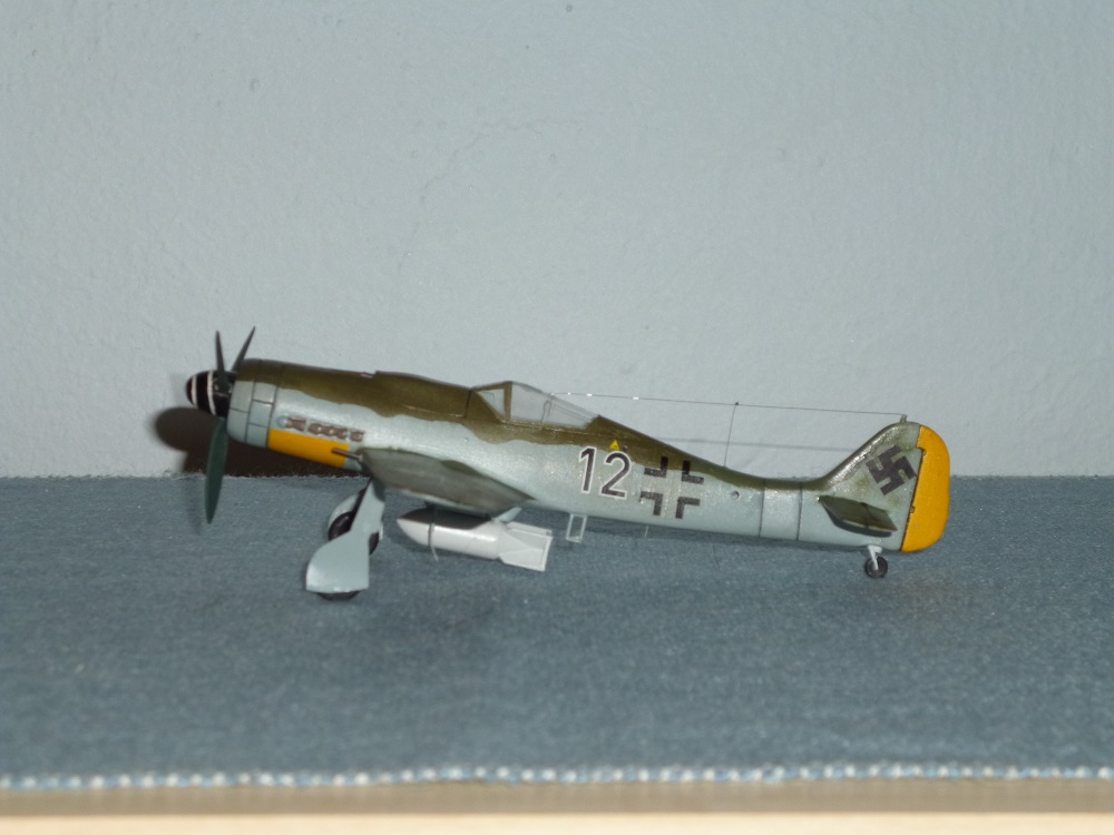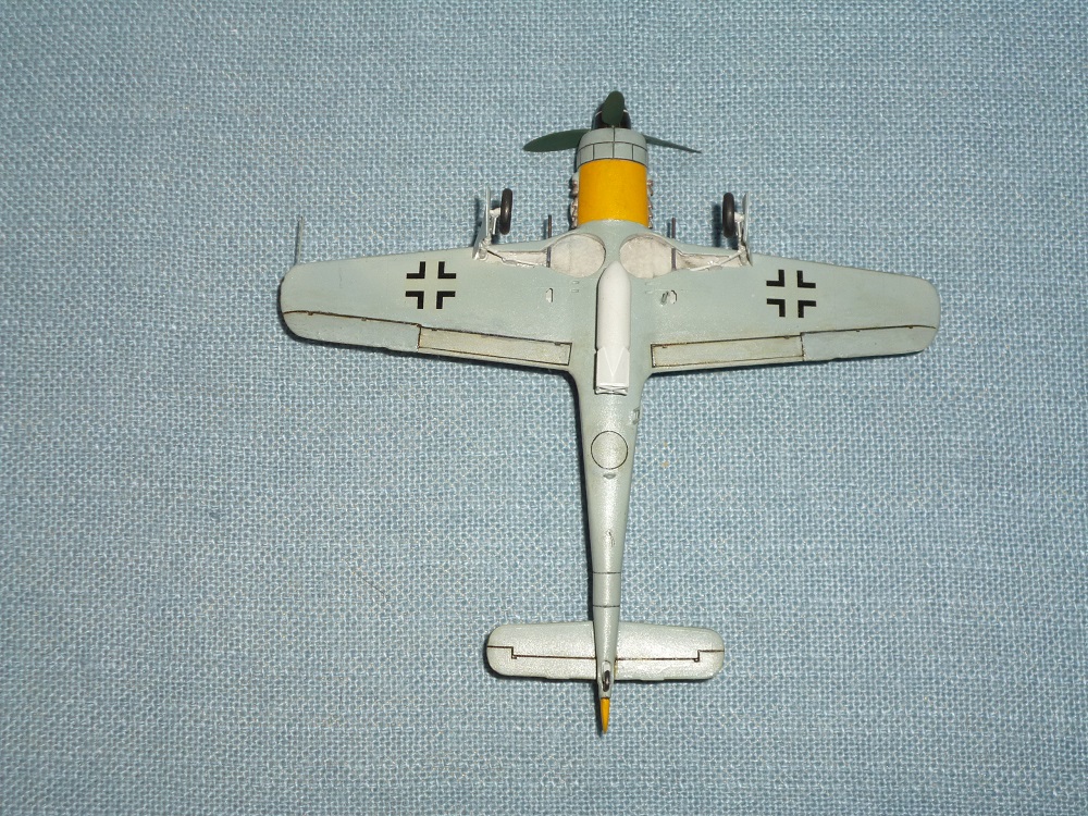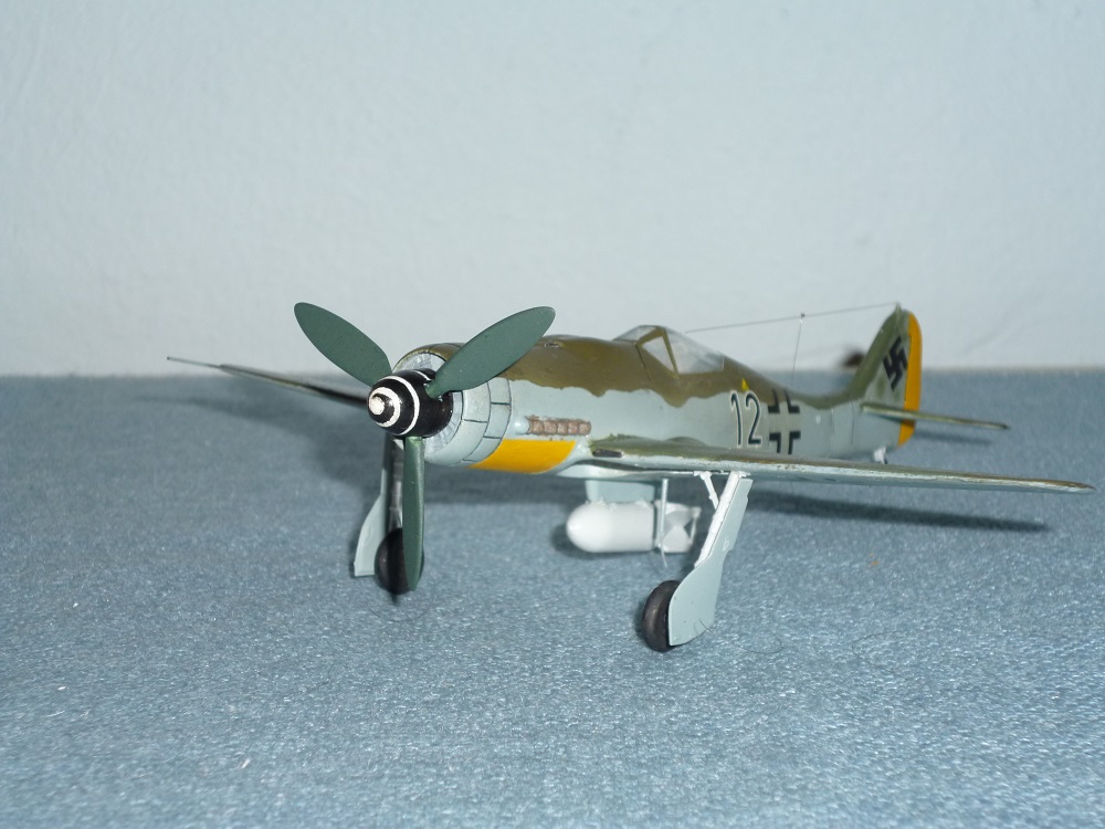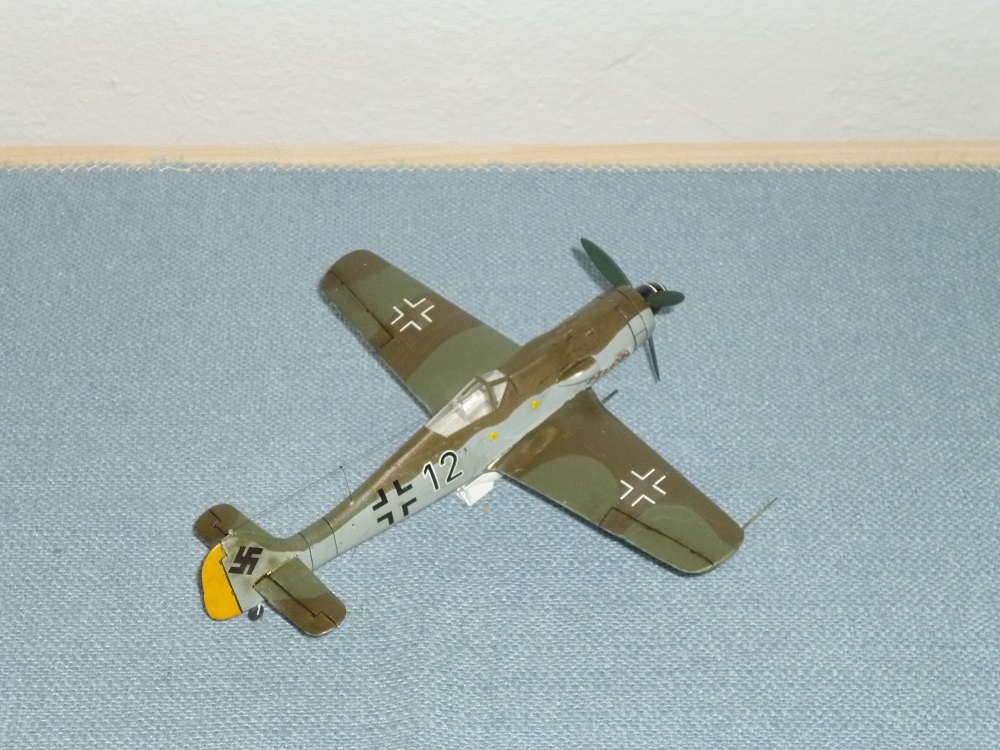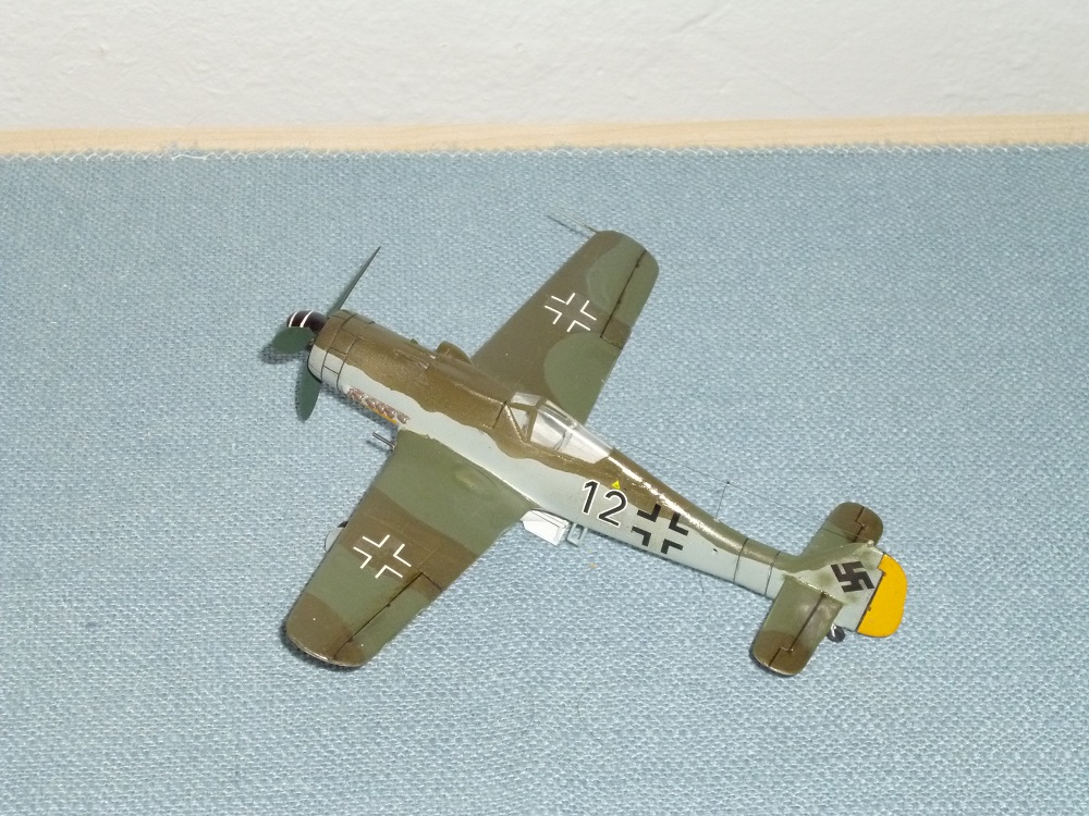 Model je farbený syntetickými farbami Humbrol a lakovaný tiež so syntetickým lesklím lakom Revell.Tento model je môj prvy model,ktorý som farbil so striekaciou pištolou.Vrtulovy kužel sa podaril až na tretí pokus.Natiahnute lanko anteni je z monofilovej nite.Spári na kridlach,na vyškovkach na smerovke a na pohiblivych klapkach chladenia motora som zvyraznil temperkami.Pilot Lt.Theo Nibel 10/JG54 .Zhruba tolko k modelu.