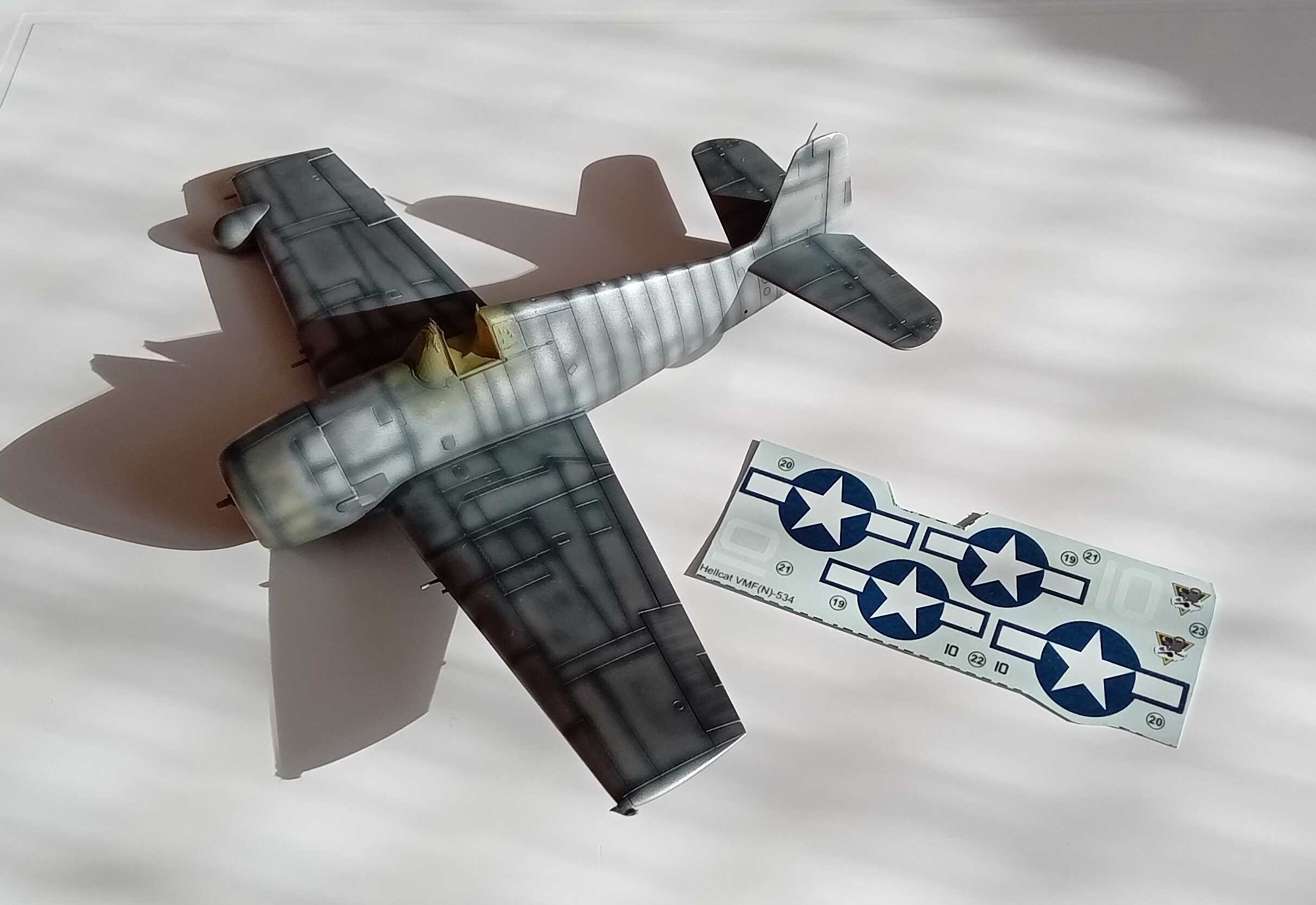 U druhého modelu jsem se rozhodnul změnit kamo. Dostaly se ke mně dekály na F6F-3N z dekálů "US Marine Nigtfighters" od OWL decals. A návod z jejich resin sady s přesným umístěním rodiovýškomněrů pod křídlem a VOP. A protože model Hellcat obsahuje díly i na nočníka, volba byla jasná. Zvláště když Eda tuto verzi dekálově nedělá. Tedy 1:72, 1:48 je v RC, z té obšlehnu kamo.