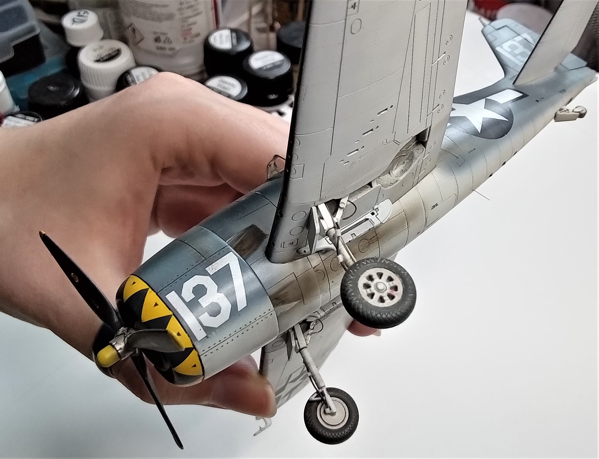 Ještě jsem musel kapku doplnit podvozkové nohy. Tento Hellcat nemá kryty podvozku, vypadá to divně, ale je to správně. Nezapomněl jsem je nalepit...