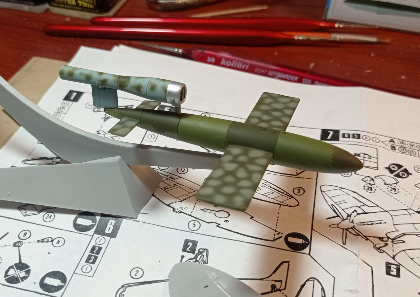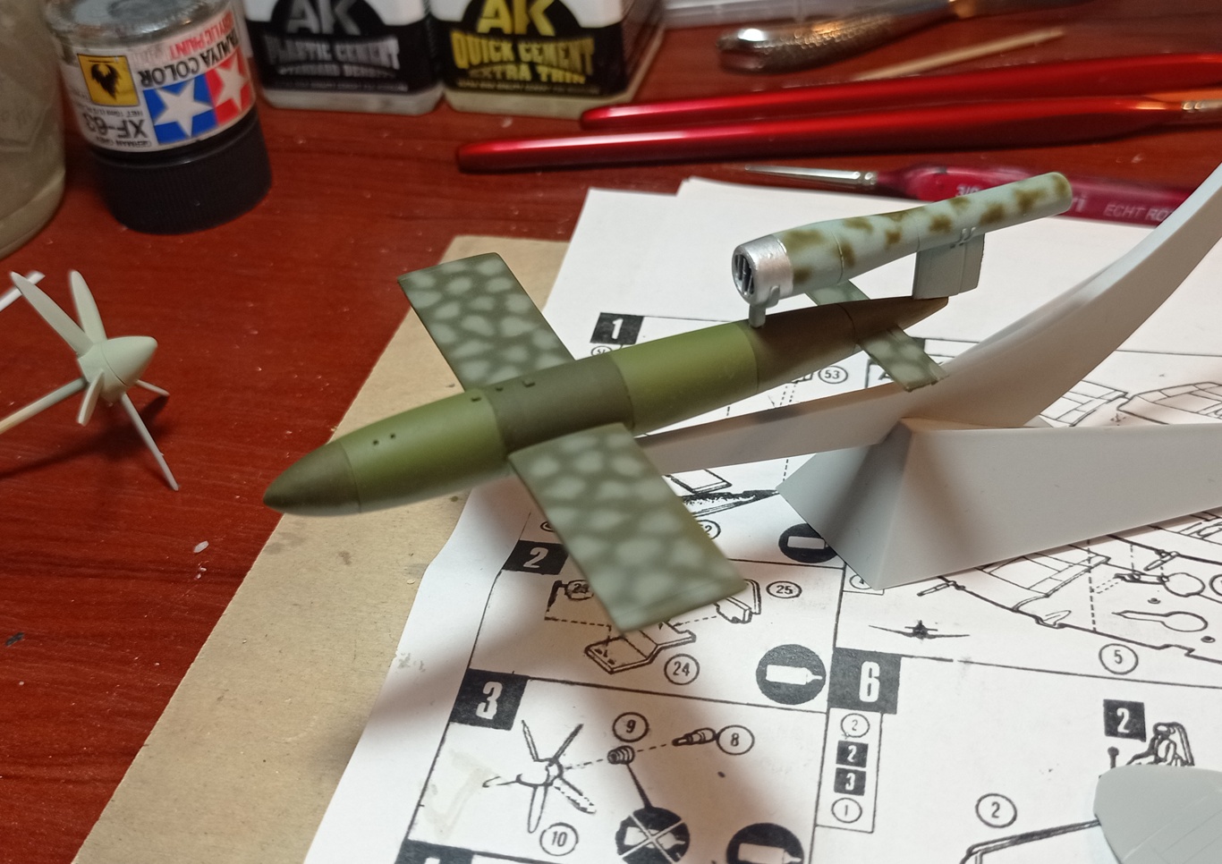 Včera večer kamufláž na V-1. Inspirace z nějakého modelu 1/32. Barvy Vallejo RLM71, 82, 65 a 02.
