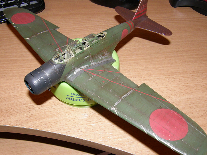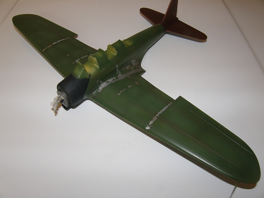 Pomalu se stavba blíží ke konci.Usadil jsem na model obtisky a napustil wash.Dál je stříknutej polomatným lakem.Sundal jsem masky a přilepil motor a výfuky.