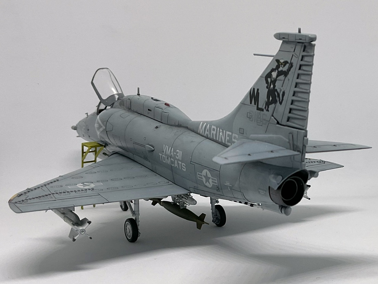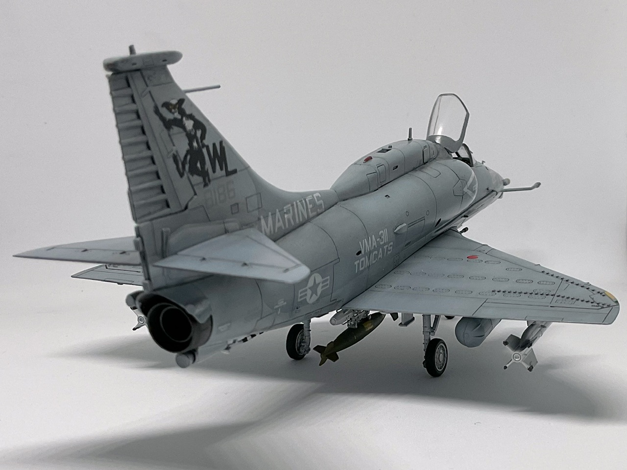 Douglas A-4M Skyhawk, Hobby Boss 1/72, No. 158186, US Marines, VMA-311 Tomcats, 1984. Doplňky Reskit (MER, AIM-4B Sidewinder a kanónové pouzdro GPU-2/A 20mm), Eduard M. A. (Mk.82), Aires (kanónové hlavně a dvířka podvozku), nějaké zbytky plechů z domácího vrakoviště, jinak je to jen krabička. Verzově je to typicky HoubyBosí kočkopes, ale řešit jsem to nechtěl, chtěl jsem jen rychlostavbu pěkného kitu do poličky.