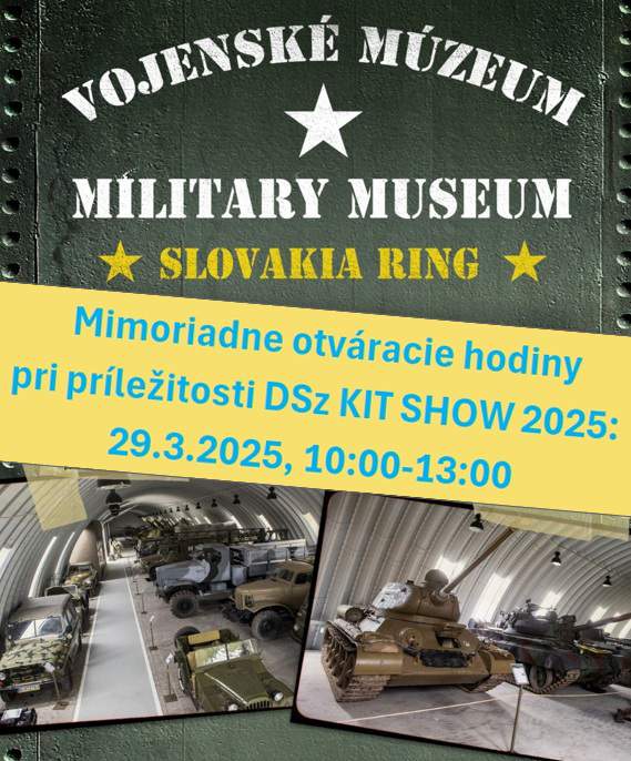 Pre návštevníkov a účastníkov podujatia DSz KIT SHOW 2025 máme vynikajúcu správu - po dohode s Military Múzeom pri Slovakia Ringu bude v deň konania podujatia múzeum výnimočne otvorené od 10.00 do 13.00.