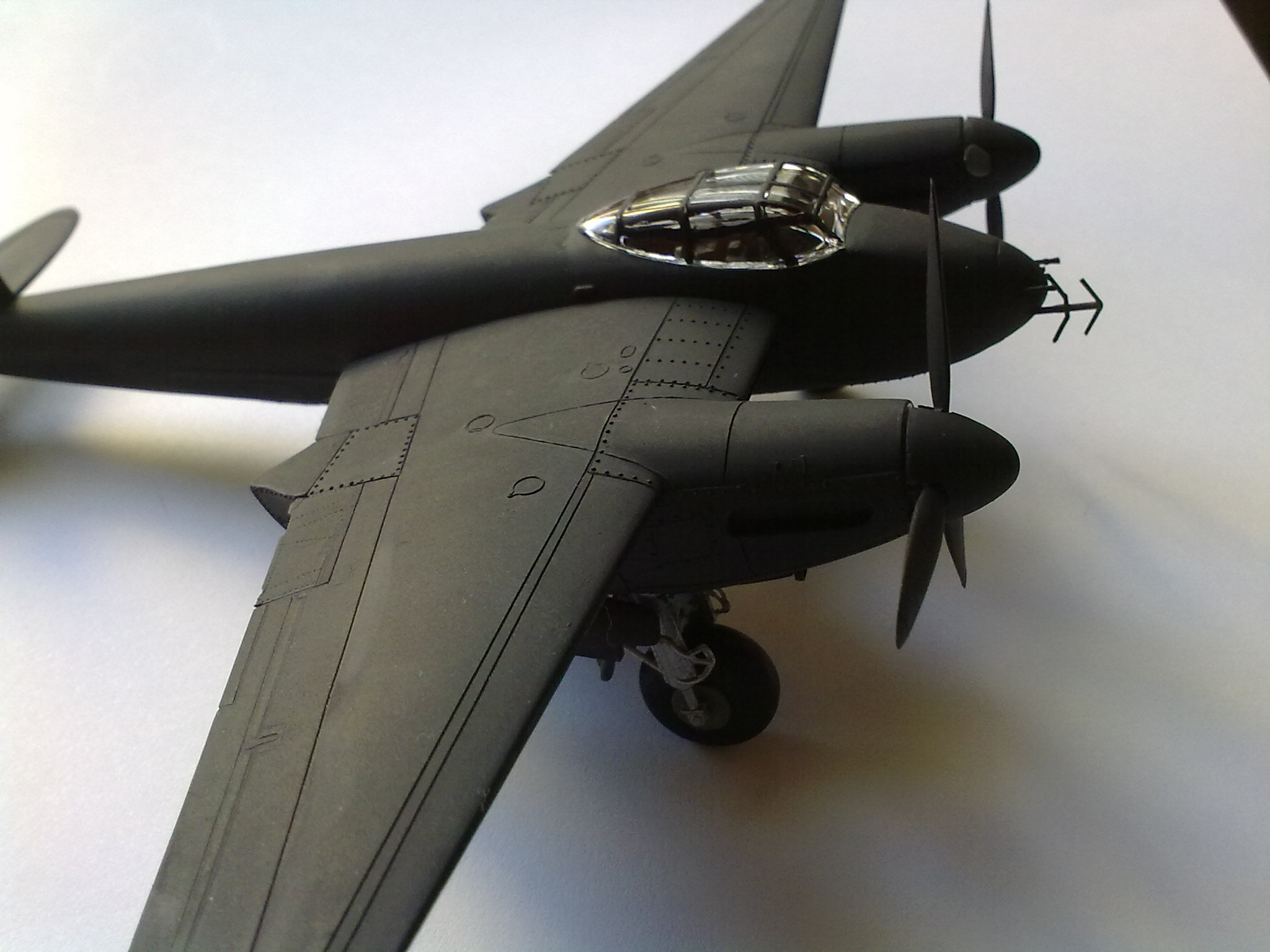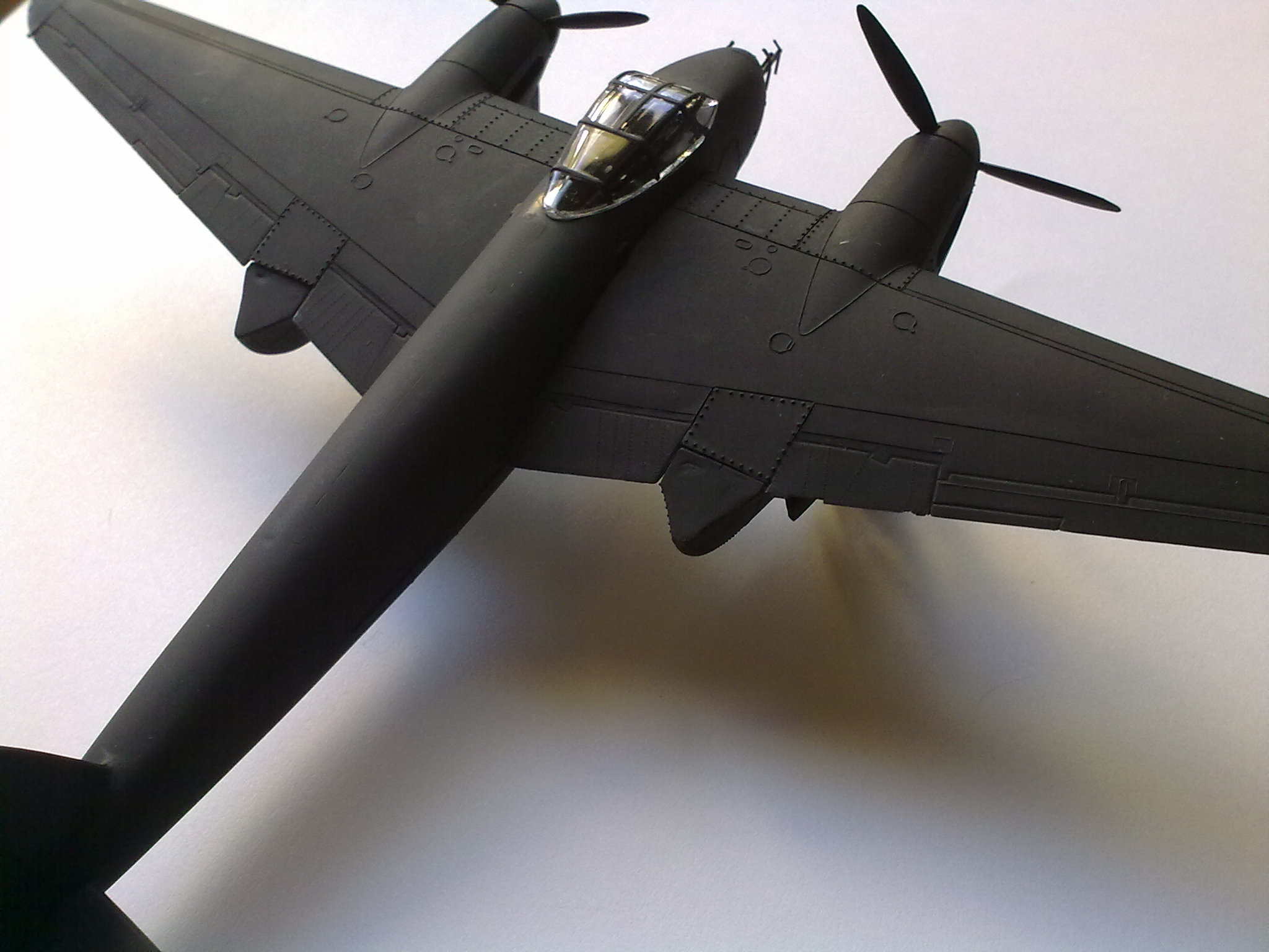 Asi som trochu neaktualizoval stavbu. Model má vytmelené gondoly, len som fotky ešte nedal. Anténa je iba jedna nalepená. Druhú som nechal nakoniec, aby som ta upresnil so situáciou. Ver mi, ak by som sa snažil lepiť podvodzok nakoniec, tak by mi ten plast popraskal. Už len pri relatívne bezpečnejšej montáži pred uzavretím gondól mi praskly obidva podvozky. Viem, ja blbec som stavebnice kúpil s vedomím že model ako model. Mosquito som kúpil za 3 € na Plastic Session, tým zodpovedá aj kvalita. Linka je vytmelená, gondoly tiež. Len som hodil fotky, a popisal trochu budúcnosť. Ospravedlňujem sa.