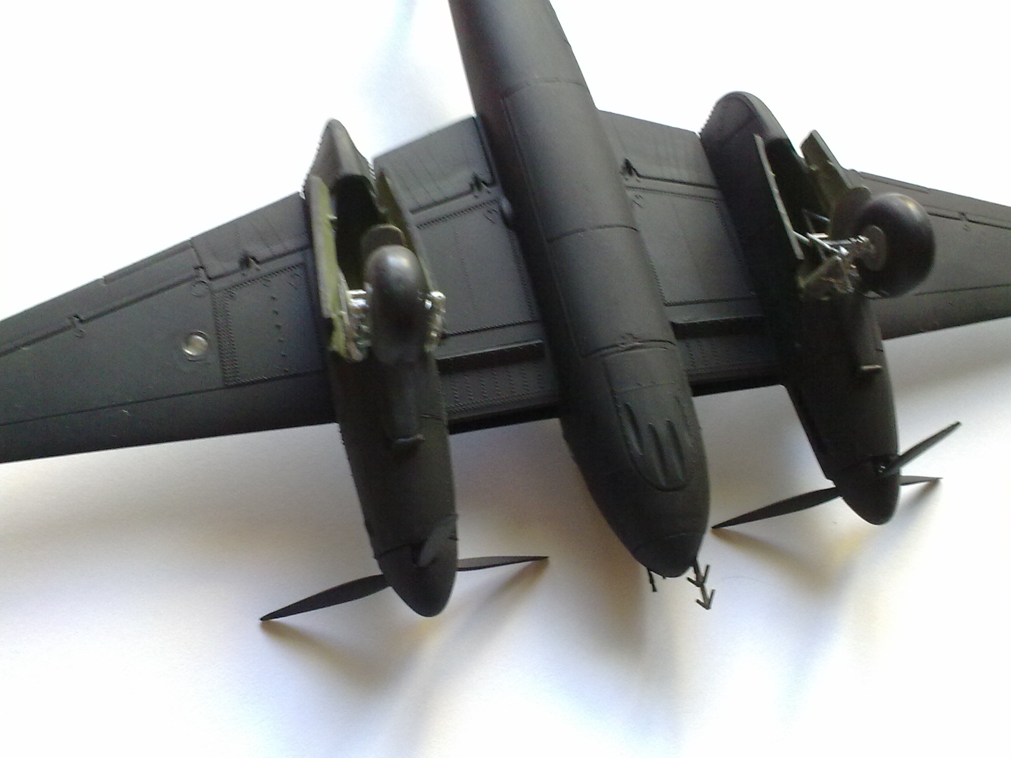 Tak po dlhom čase sa konečne môžem pohnúť v stavbe ďalej. Ako ste mnohý už zistili, mám Airbrush set. To znamená, že som mohol konečne nastriekať pripravený model. Čierna farba sa strieka pomerne ľahko. Stačilo starostlivo vymaskovať všetko. Podvozkové nohy som zakryl papierom. Nasledoval nástrek. Začal som hornou stranou, postupne po vyschnutí spodnými plochami a nakoniec detailmi. S výsledkom som maximálne spokojný! Model je už pripravený na lak a dekály. Jedinou chybou je snaď to, že Airbrush aj svojím tenkým nástrekom odhalil 2 chybičky. A to plošné prepadliny na konci motorových gondól. Nuž, daň za nevšímavosť.