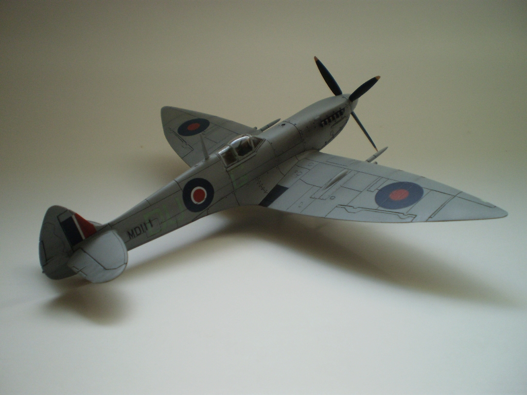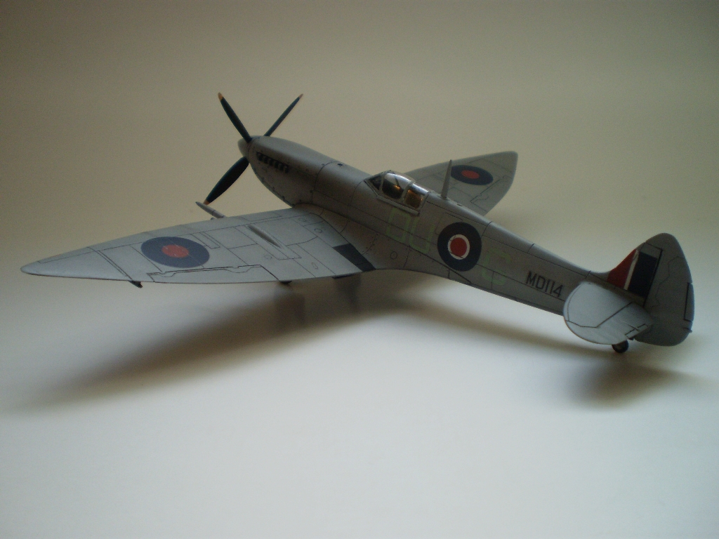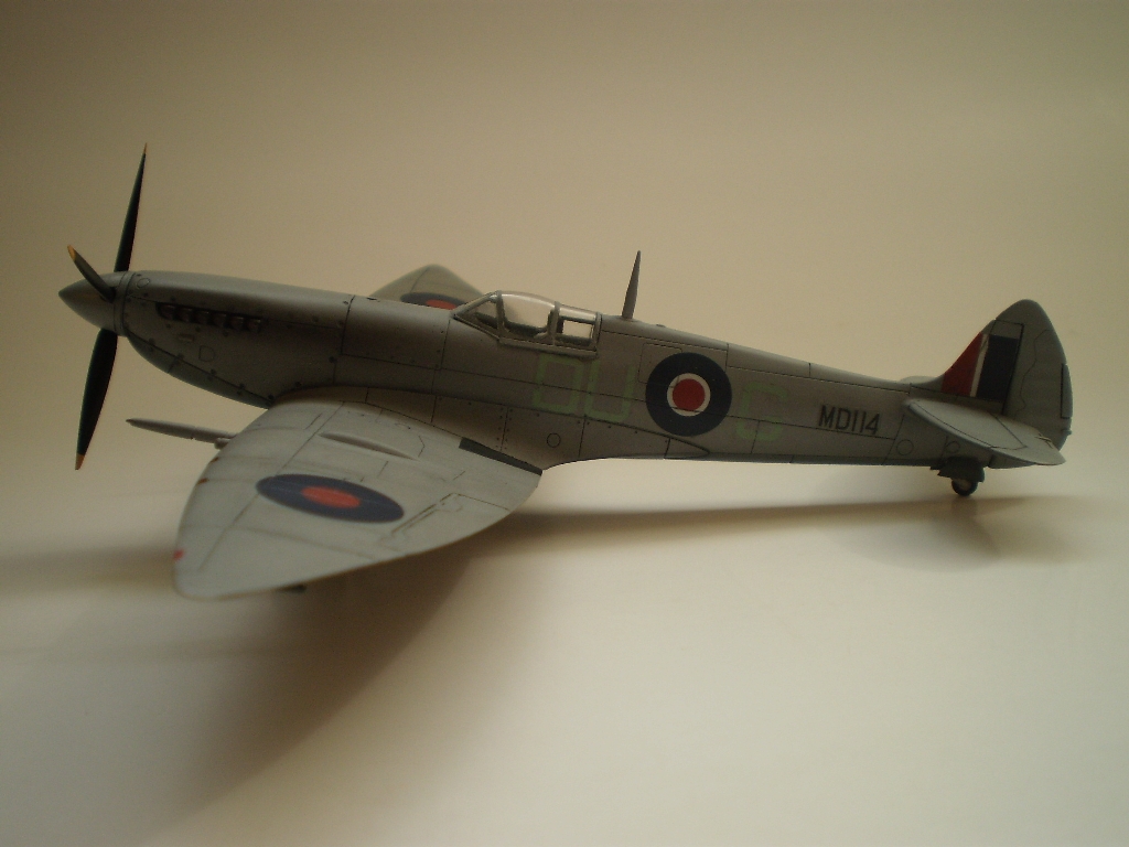 Model by mal predstavovať Spitfire HF Mk.VII, MD114, DU-G patriace od konca 10/1943 do 20.2.1944 staničnej letke (Station Flight) v Skeabrae na Orknejských ostrovoch. 20.2.1944 na ňom P/O Ian Blaire zo 616.sq. (toho času na "odpočinku") zostrelil prieskumný Bf 109G, snažiaci sa odfotografovať námornú základňu RN v Scapa Flow. Lietadlo však bolo poškodené troskami z messerschmittu a muselo núdzovo pristáť na jednom zo Shetlandských ostrovov a bolo odpísané.Viem, že fotky za veľa nestoja, ale som rovnako mizerný fotograf, ako modelár...