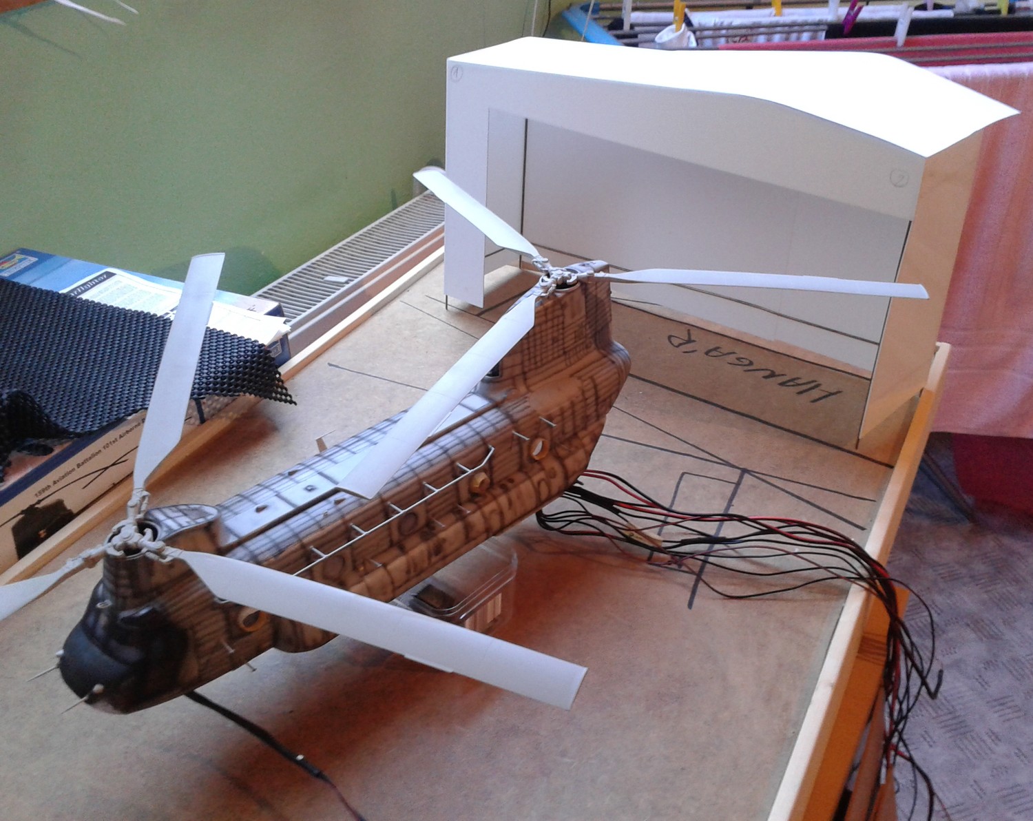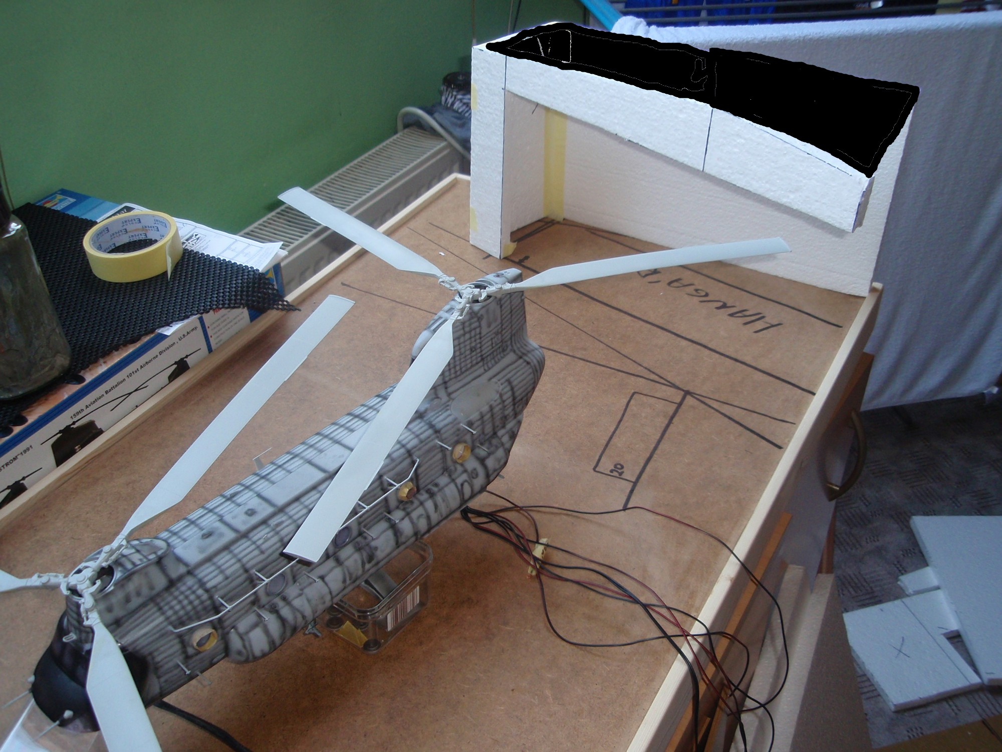 vrtulník se na podložku vejde. nebude vevnitř. NO ten tvar jak tam je čili je to do A akorát jedna strana je kratší aby se to tam vešlo prostě je to kus hangáru. JInak nevím no se mi to nějak přestává líbit s tím hangárem a přijde mi stím dost práce asi to udělám možná jinak uvidím no ještě.
