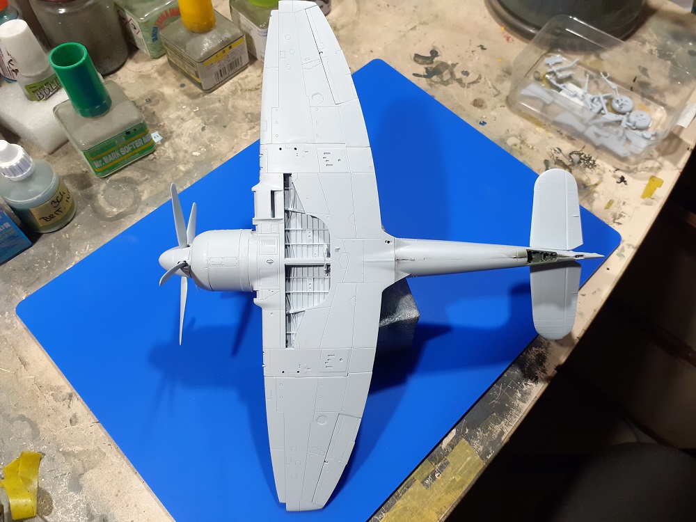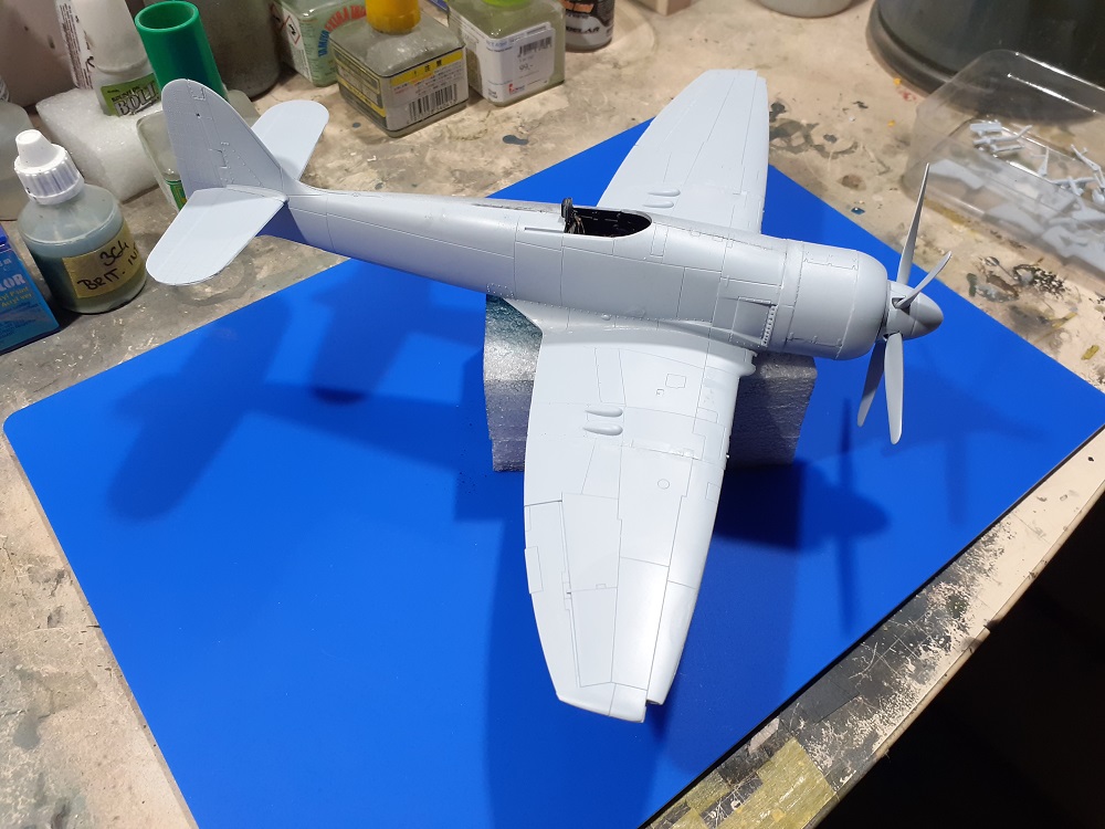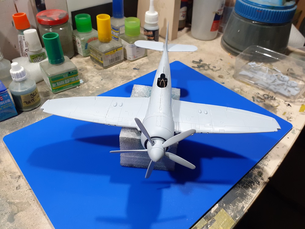 Konec března se nám blíží, takže dávám poslední stavební foto s tím, že výsledek bude koncem příštího týdne v galerii ( snad :) ) Ono už se na ní toho moc nezmění, vyjma kamufláže a drobných detailů. Neodolal jsem zkusit nabarvit a zkompletovat vrtuli ( zatím pořád jenom na sucho, ještě to není finálně nalepené a to ani kužel, proto je tam vidět takový ten drobný odskok, který potom zmizí ) . Udělal jsem drobotinu a na pár míst dal i trochu toho tmele, ale žádná hrůza.