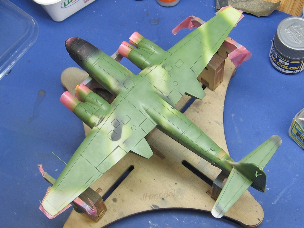 Použité barvy a kamuflážní pole jsou dle návodu Hasegawy RLM 81/82, jen s tím, že ten přechod spodních a vrchních ploch jsem udělal dle sebe. RLM81 měla být spíš více hnědá (Stejná, jakou jsem použil na Shindenu.), ale rozhodl jsem se pro tuto verzi co má Gunze C, abych měl pak rozdíl. proti verzi B, kterou bych rád udělal reál.