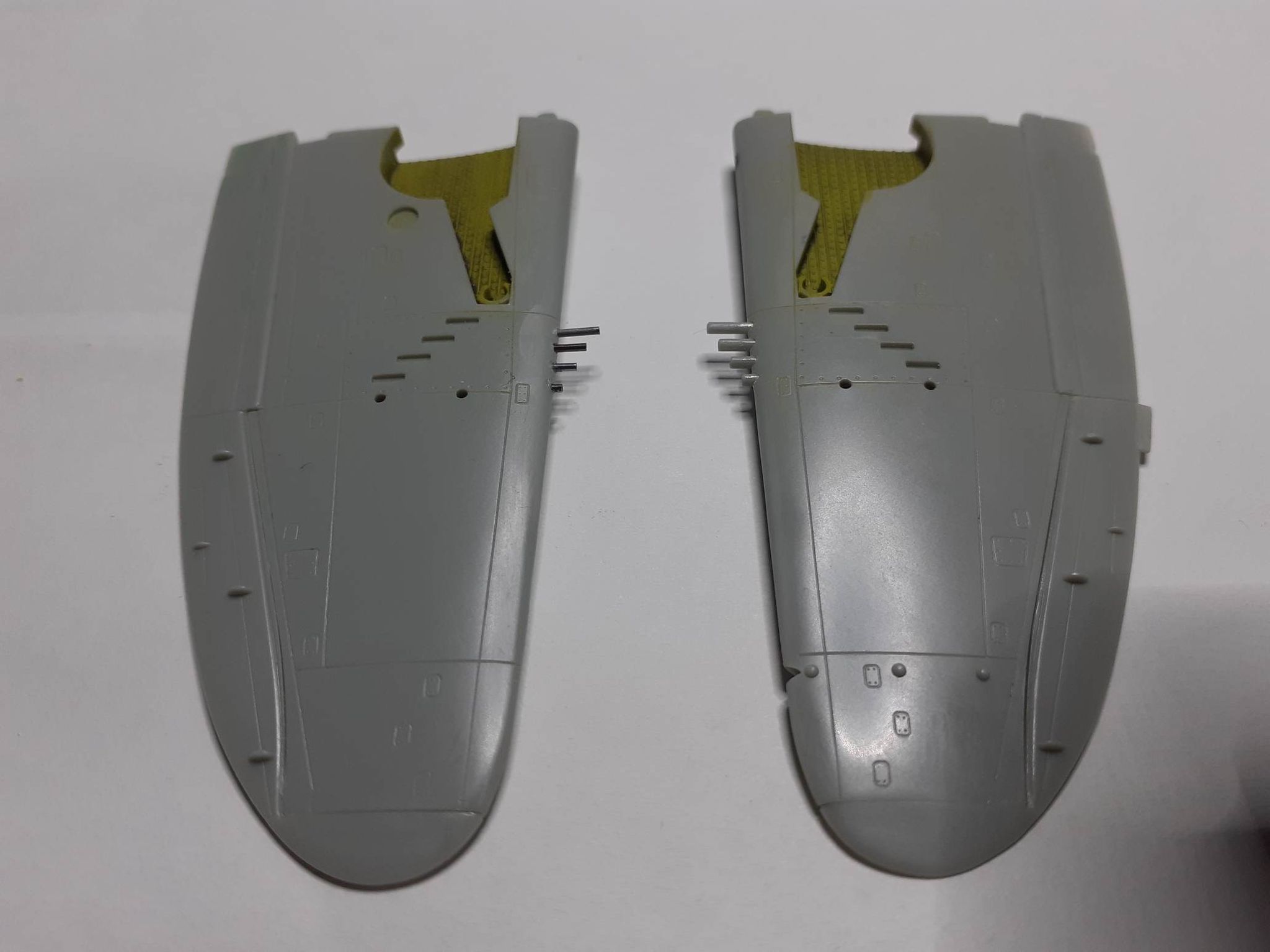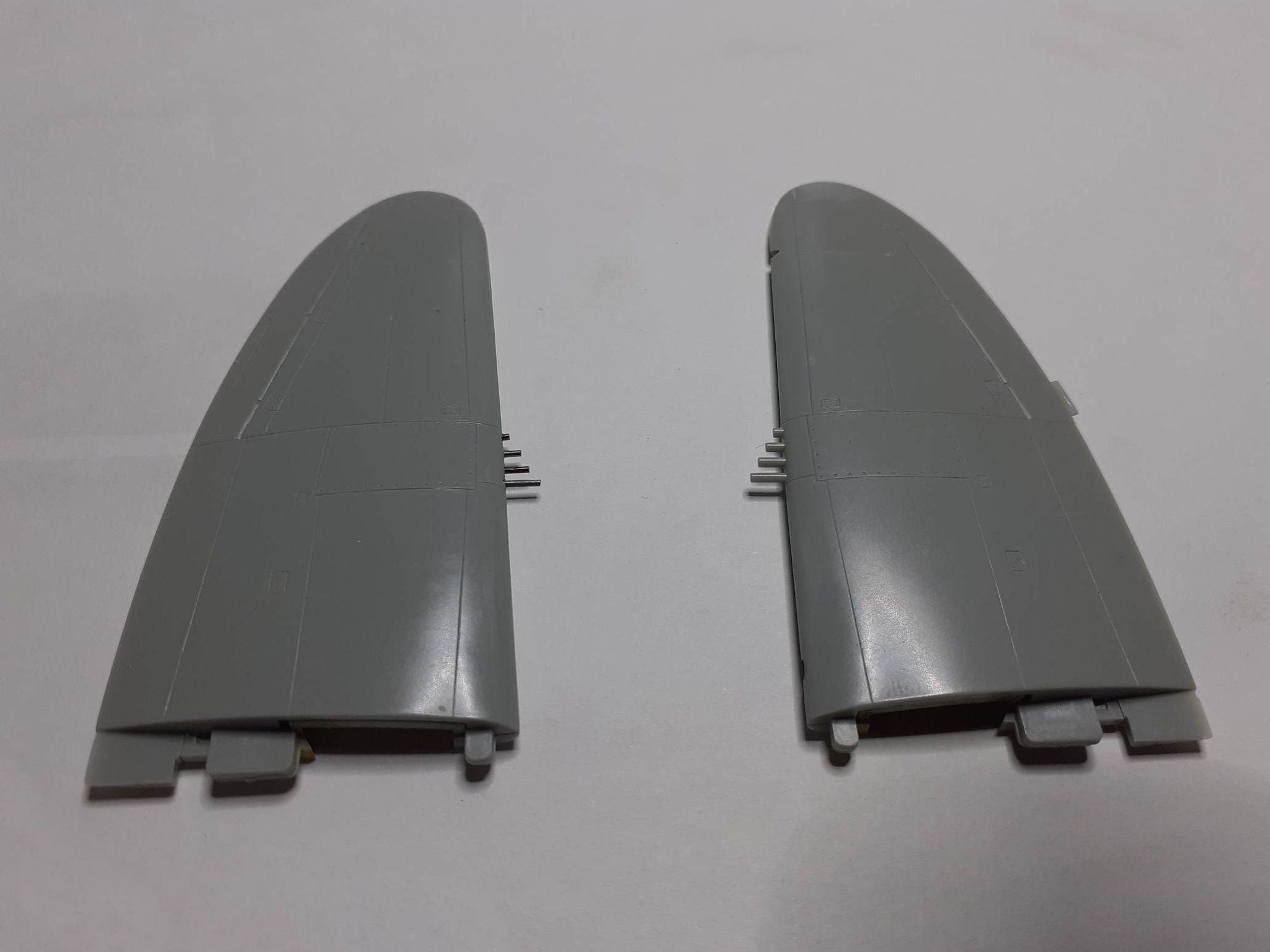 Keď som už bol včera pripravený na prilepenie krídiel k trupom, uvedomil som si, že som neurobil číre pozičky na koncoch krídiel. Tak som rýchlo prekutral svoje krabičky s "odpadom" a pohľadal kúsky čírej hmoty a dorobil tie nešťastné pozičky. Dnes ráno som potom nalepil krídla k trupom. Naposledy som lepil krídlo týmto systémom (zboku k trupu) krídlo v stavebnici MiG-21 od KP, lebo aj keď som lepil Halifaxa, tak tam boli aspoň pomocné nosníky, na ktoré som nasúval polovice krídla. Dolepil som aj vodorovné chvostové plochy a nastavil ako tak geometriu. V príspevku so zlepovaním trupu som zabudol napísať, že u trupu Razorbacku som vyrezal miesto pre šachtu ostruhového kolieska, lebo som našiel vo vrakovisku ešte jednu kompletnú šachtu z Revellu (určite pozostatok po krúžku ktorý som kedysi viedol na škole). Takže draky Thunderboltov sú hotové, najbližsie môže nasledovať nástrek primerom.