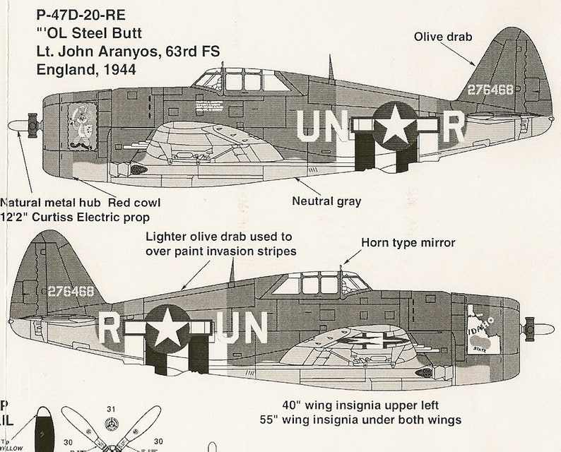 Tak zmena vážení... pri blúdení po nete som narazil na zaujímavého Razorbacka, dokonca zo Zemkeho svorky (Zemke's Wolfpack) - P-47D-20-RE, 42-76468, UN-R, "Ol Steel Butt/The Idaho Spud"; pilota Lt. Johna A. Aranyosa. Síce to kvôli dekálom bude znamenať ďalšie zdržanie, ale bola to "láska na prvý pohľad". Dekály už síce kreslím, ale s tlačou budem musieť počkať, až sa mi toho nazbiera dosť na celú A5. Zatiaľ budem zvoľna pokračovať, až kým nedorazím k farbeniu. Ešte som sa nerozhodol, či počkám aj s Bubbletopom a budem potom pokračovať spoločne, alebo toho dotiahnem dokonca a potom, až budú hotové dekály, dotiahnem zvlášť Razorbacka. Zatiaľ tomu nechám voľný priebeh.