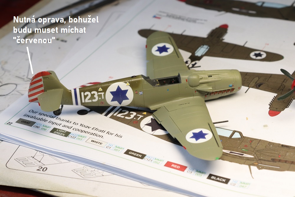Po týdnu jsem se konečně dočkal a dávám obtisky. Musím říct, že mě zarazila ta vyblitá červená použitá v obtiskách. Zaprvé je vidět, že je hodně průsvitná a zadruhé červená neodpovídá ani vzdáleně červené doporučené v plánku a ani té co je v barevném návodu. Nevím jestli to tak měli v reálu Izraelci, nejsem odborník. Štve mě to hlavně z důvodu toho, že se mi obtisk na směrovce trochu ohrnul a já budu muset míchat přesný odstín. Škoda, u Edíků bych tohle nečekal.
