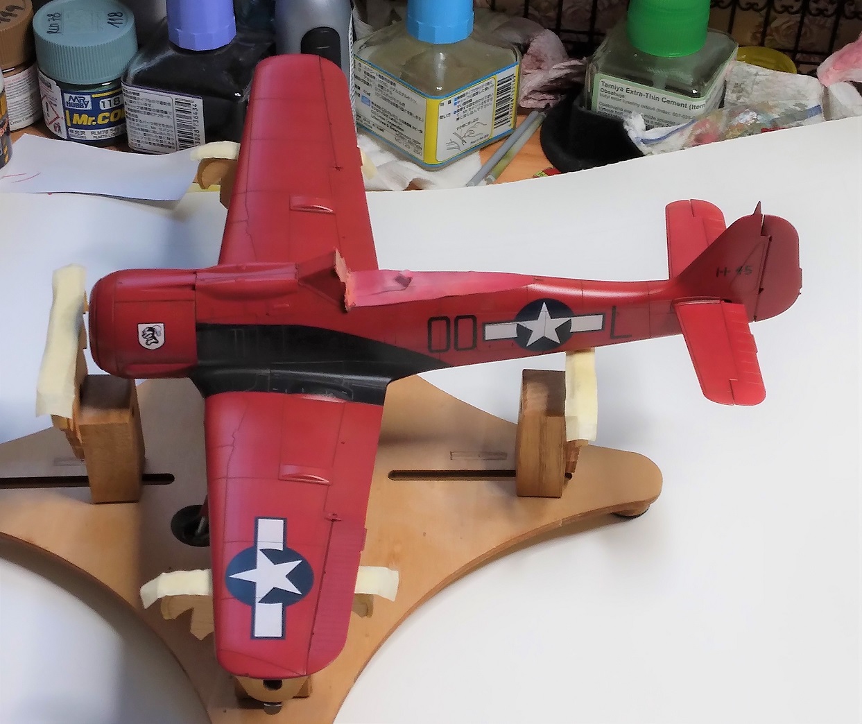 Tak pokračuji. Rychlovka mobilem. Nakonec použil wash jak červenohnědý, tak i Neutral přes znaky (přece jen červený v bílých polích znaků byl jako pěst na oko). V černé je wash ze sady na rusáky zelená+černá barva na horních plochách. Alespoň jej využiji jinak než na Jaky-1 a Finy... Na fotkách to není moc, tedy skoro vůbec znát, ale jsou tam. Kur... hodně zklamaly dekály Eduard (staré neloupací).Podkladová bílá není i pod celou modrou, ale pouze cca do do poloviny lemů a tak dělá pěkný schod. I přes několik vrstev lesklého laku je to prostě vidět.