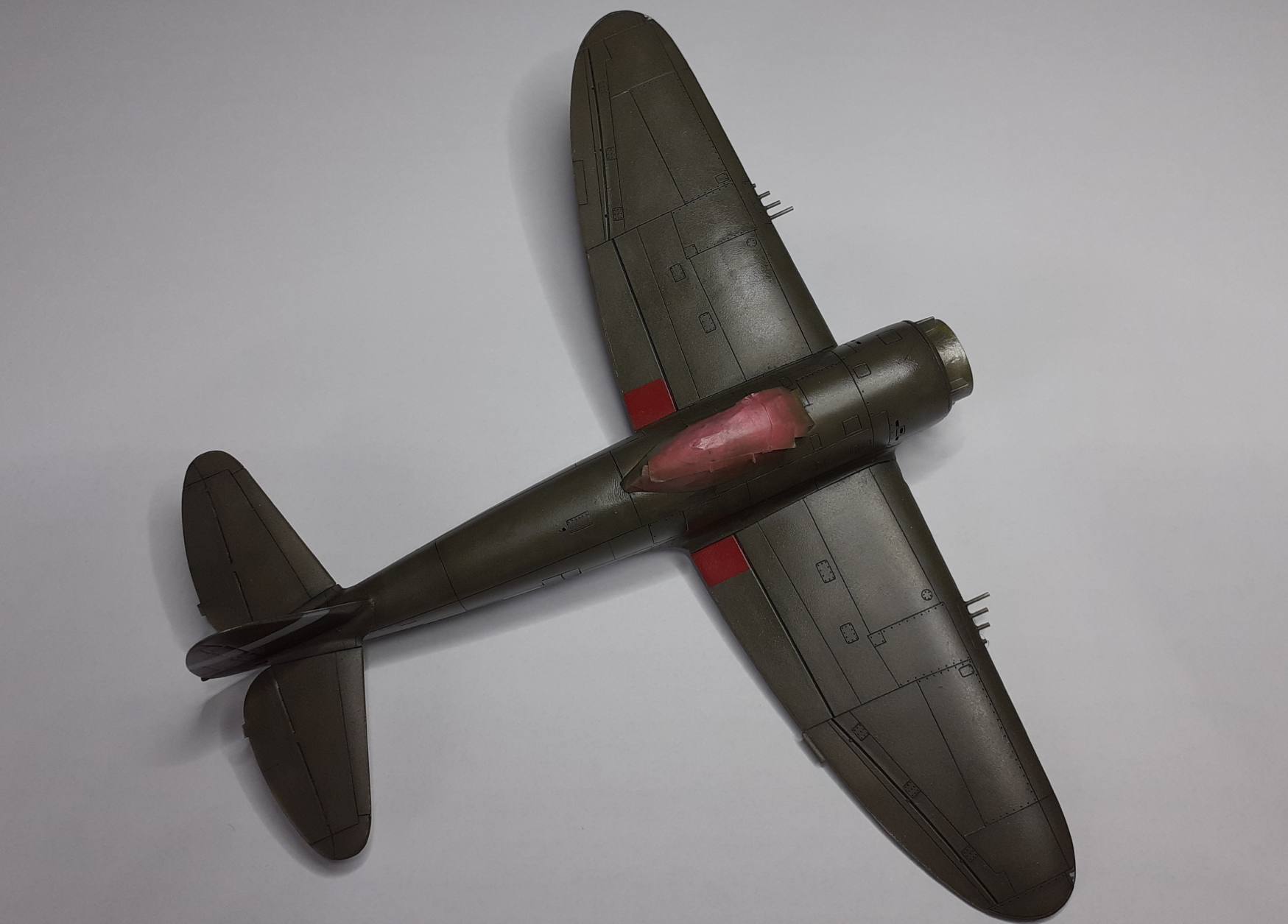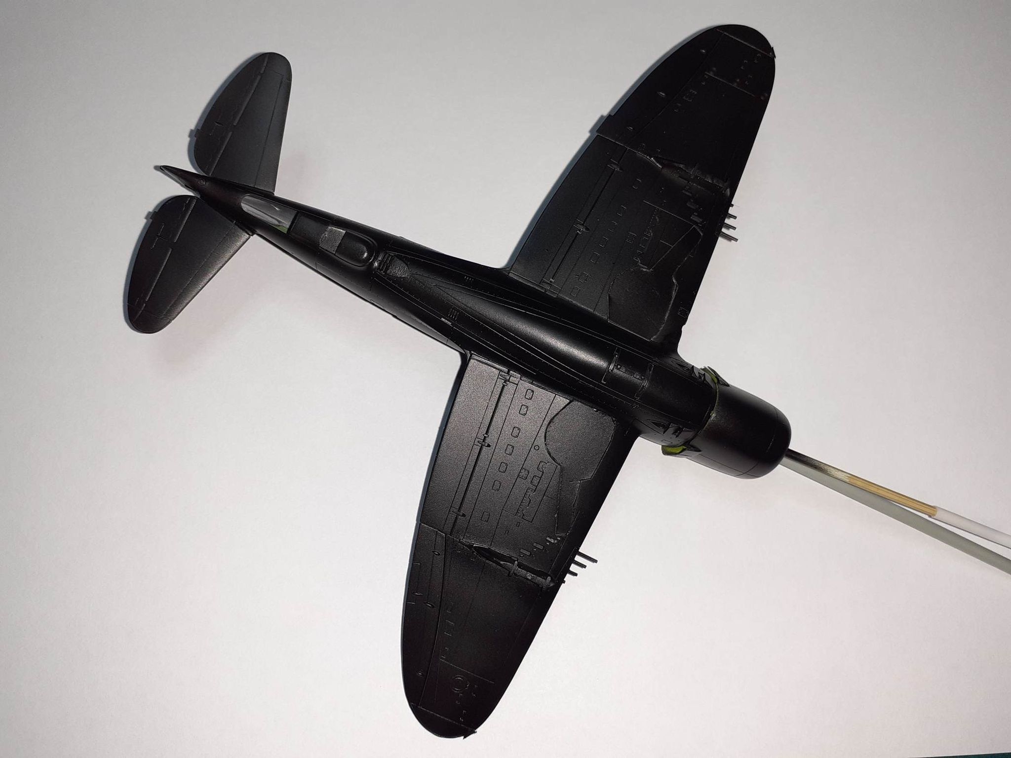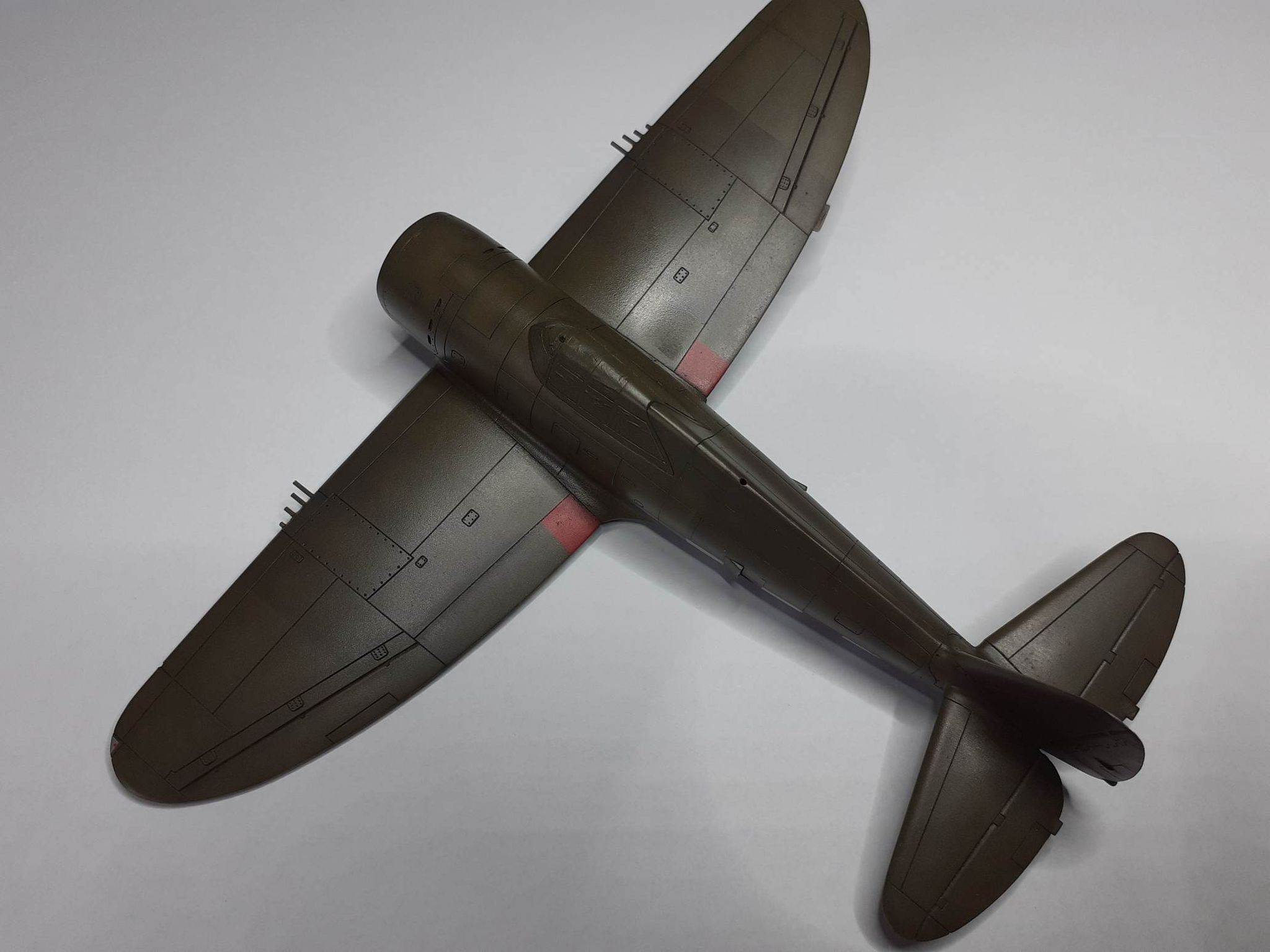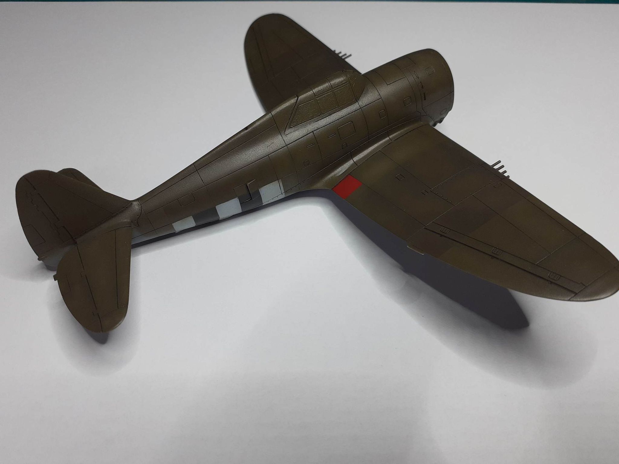 Konečne vo farbe. Nastriekané aj zbytky "AEAF stripes". U Razorbacka som naznačil aj novšiu, sýtejšiu farbu u prestriekaných pásov. Podľa fotky mal na krídle pravdepodobne nepredpisovo umiestnené tie pásy - viac smerom von, ku špičkám krídla. V návode ku štvrťkovým dekálom je poznámka, že na trupe má byť u tej prestriekanej plochy svetlejší odtieň Olive Drab, ale je to akosi nelogické. Aj podľa fotky, ktorú som sem dávnejšie dal, sa javí tá časť naopak tmavšia.