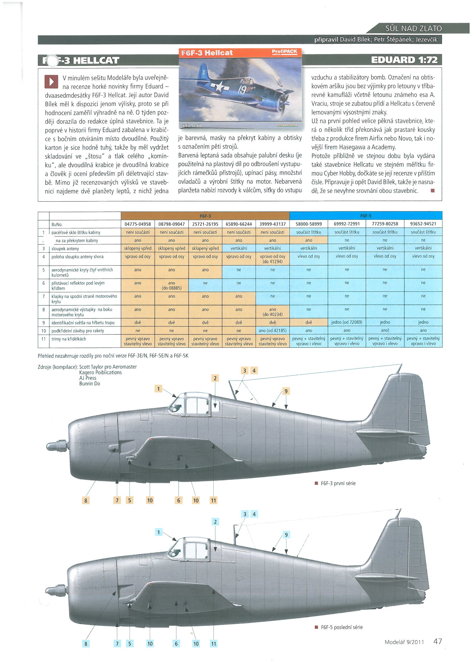 V Mo 9/2011 je u recenze modelu F6F-3 Edu hodně pěkná tabulka odlišností Hellcatů F6F-3 a F6F-5 dle výrobních čísel. Je tam i do jakého čísla byly bouličky, spodní klapky na krytu motoru, reflektor pod křídly, trimy, kolik identifikačních světel na trupu a další odlišnosti. Teď nemám přístup ke skeneru, až zítra odpoledne v práci. Ale pokud máte Modíka někdo doma...