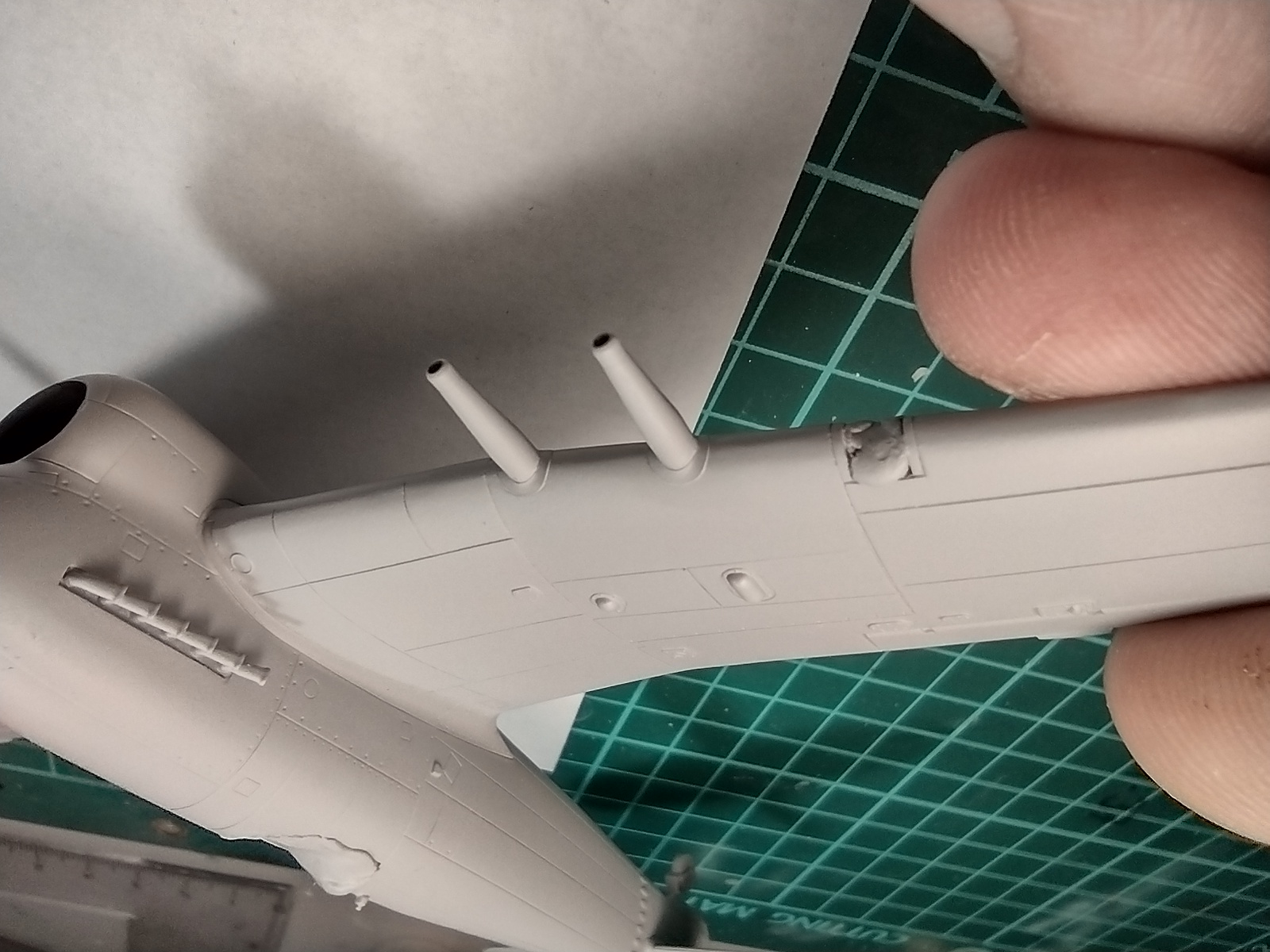 Brengun jsem stavěl. Normální shortrun až na to, že skoro půlka rytí na modelu a některé detaily v šachtách byly vytržené. Můj odhad, že to bylo nejspíše způsobený nezkušeností mástraře v přípravě modelu do měkkých forem. U mástru totiž nesmí být ostré a hluboké rytí nebo moc ostré detaily v šachtách třeba. Jinak jsem u toho Brengunu bojoval s pasováním křídel k trupu. Musel jsem trochu zbrousit šachty podvozku kvůli lepšímu lepení horních polovin křídel. Dále jsem musel lehce odstranit trochu plastu z každé strany vrchních křídel v místě napojení na trup.