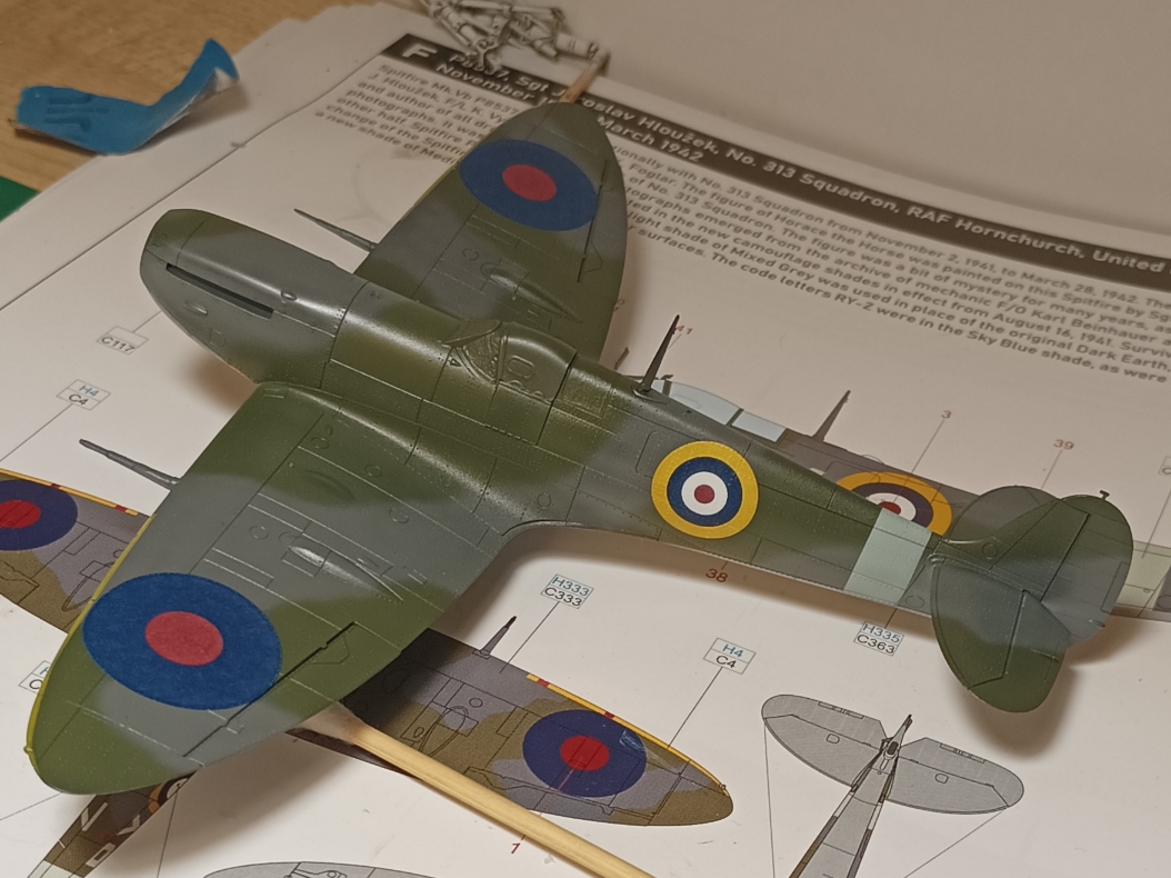Hotová kamo+ lak. Dekáluji. Kolegové měli pravdu. Ty pozitivní nýty na levé půlce trupu super, na pravé lokomotiva. Seru na spity. Chtěl jsem aspoň tři až pět. Dodělám to a tak za rok si koupím overtrees a dekály AML na tu mašinu s kotětem, protože to musím mít. Ještě, že Ježíšek přinese další stodevítky, normálně Eduardi že mě, starého spitfirofila udělali spitfirofoba a mezkofila. Jo, dnes jsem v Dráčku potkal revelovic Ju-88, lehounce nad pětikilo, tak ty stodevítky nebudou tak opuštěné...