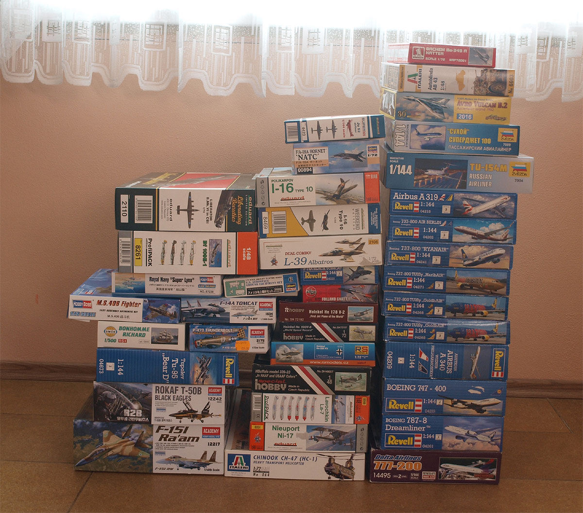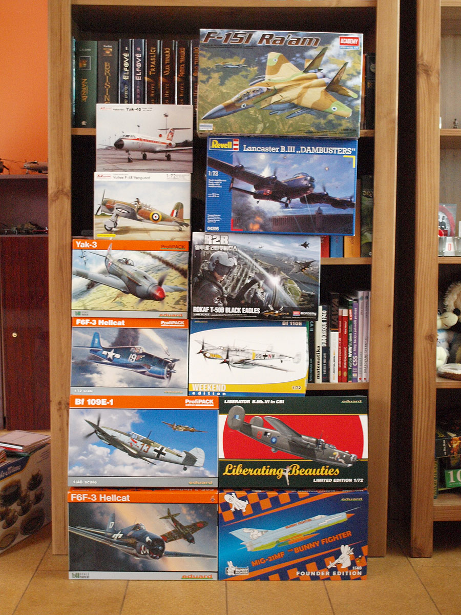 Tise zavidim... Ja nemam cas na lepeni a tak uz asi snad deset let jsem vice mene jen sberatel.... Jsem uzce spjat s firmou Az tak jejich plastiky mam az na velmi male vyjimky komplet.. Hodne dvakrat. A ostatni vyrobce uz neco ani nevim ze mam a jak to nekde vidim tak kupuju... Takze neco mam vic jak dvkrat.. Mam uchyku, ze jak neco nemam dvakrat tak to nestavim aby mi to pak nechybelo... takze jeden z poslednich prirustku je He-219 1/32 od revellu a uz spekuluju jak domu propasovat druhyho... Stejne je to se spitem 1/24... Dalsi moje uchylka je Vaku... minuly tyden se zacatkem skolniho roku jsem od Petra Muzikanta (za coz mu dluzim jeste jednou velky dik) dotaknul krabici vaku modelu 1/48.. Prevazne bombardery japonsko a anglie. Stirling, Halifax atd... To bylo doma radosti.. MPM vaku mam temer komplet a neco i dvakrat. Do217 snad petkrat v ruznych verzich.. Eduardi ctvrtky hlavne Fw190 mam taky pekne naskladany. Jejich Airacober mam 8... Ani to nemuzu vyfotit i kdyz to mam v jedny maly mistnosti. Mam to trema radama. Stehovani z dnesniho detskehopokoje do podkrovni mistnosti trvalo pul dne a to jsem jen podaval nahoru a nahore rovnali.. To se to ukazalo v plne nahote co tam vsechno je a nemluvila se mnou dva dny doma ani klika od dveri.. snad jen pes.. tomu je vsechno jedno.. Do vitriny se mi nastehoval syn a udelal si tam vystavku anglicaku tak tech mych par modelu co se dam jeste drzi zuby nehty asi za par dni poputuje do krabice a na pudu aby nedosli uhone.. Ale odtamtud je az vyndaji nejspis archeologove.. Diky dvema detem a uchylkou na sledovani televize nemam moc casu na staveni.. tak ze jen kocham prohlizenim modelu prineseneho do loznice a pak zase vyexporotvaneho zpet. Jen jednu posledni radu na zaver.. az si budete nekdo delat pracovnu na pude, tak si vyberte tu pulku pod kterou nejsou detske pokoje jak ja...