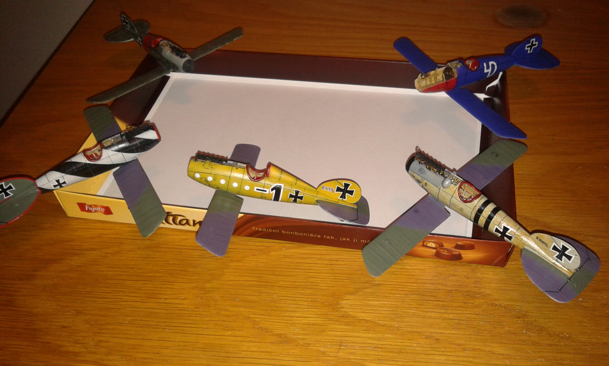 Nadřevil jsem Dostlera, natřel kožený lemy kokpitů, záhlavníky a chladiče, dolepil VOP a ostruhy a vše stříkl lesklým lakem. Teď makám na vrtulích. Zítra, pokud se mi bude chtít, nanesu dekály a budu washovat. Pak něco nafotím... ;)