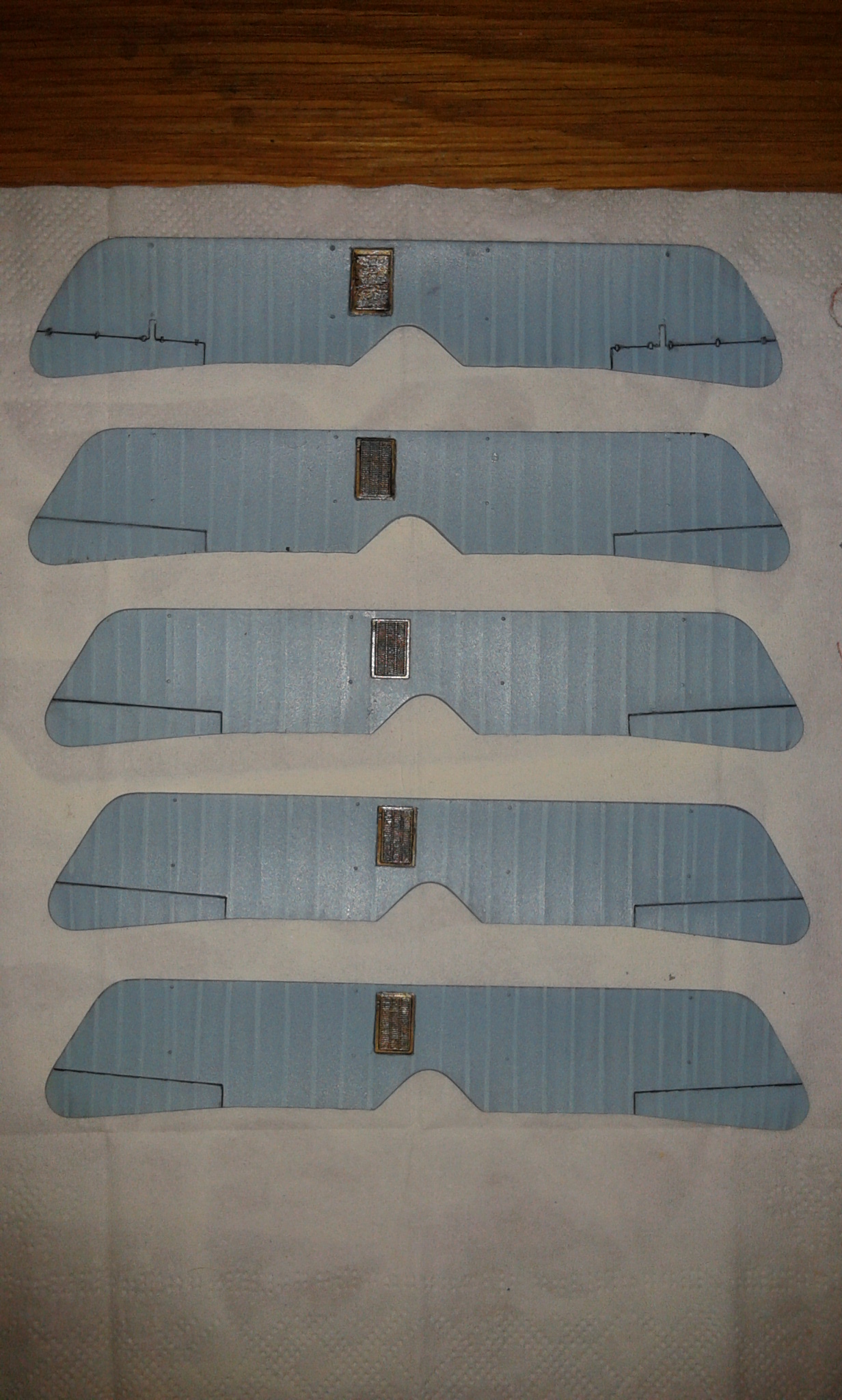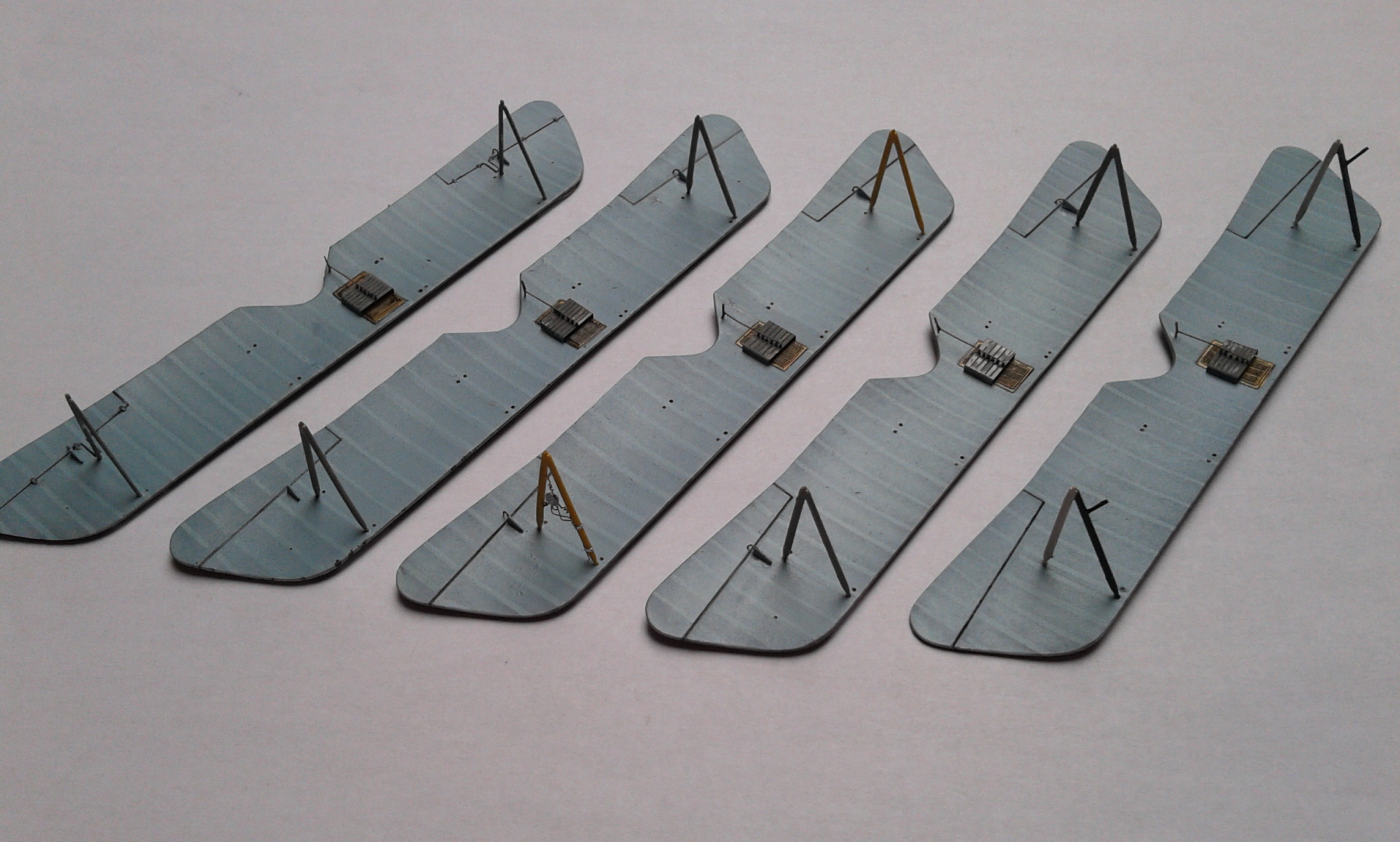 Tak po delší pauze způsobené stěhováním, zabydlováním a opravou poloviny modelů, co utrpěli při stěhování větší či měnší škody (chmelnice jsem naštěstí přepravil bez nehod), se pomalu vracím k Albatrosům. Nalepil a nabarvil jsem ovládání křidélek, Gonterman a Dostler dostali kulomety a zhotovil jsem lamely s ovádáním na spodky chladičů. Nejsou sice všecky tip ťop, ale pod horním křídlem jsou špatně viditelné a tak mi to stačí. Teď už jen sestavit tři páry plechových kulometů od Edy, natřít pneumatiky, vyrobit napínáky, uchycení výpletů a dodělat pár detailů a můžu začít kompletovat a vyplétat.