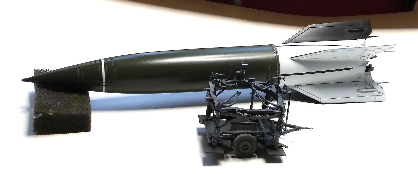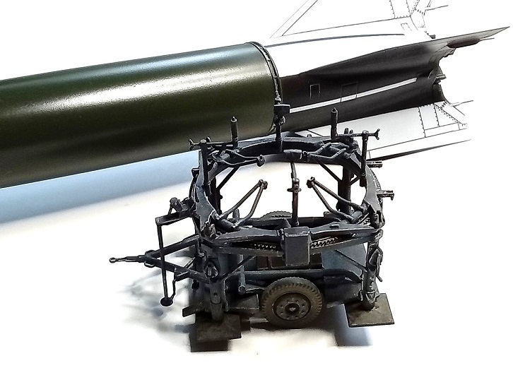 Doděláno metodou ŽÁVES (Žádný Velký Xraní) ... Podklady na to nejsou, našel jsem jedinou fotku zepředu. Model jsem potřeboval pod A4/V2, kdy jsem chtěl startovací stolici v přepravní poloze a řešil jsem kam s rachejtlí. Největší zdržovačka byla se začištěním trubkové konstrukce a hlavně s koly, které jsem měl přesazené skoro o 0,5 mm. Takže ve výsledku jsou na průměru menší než by měly být, já to vím, nyní i Vy, ale to je tak všechno, co s nimi chci dělat ...