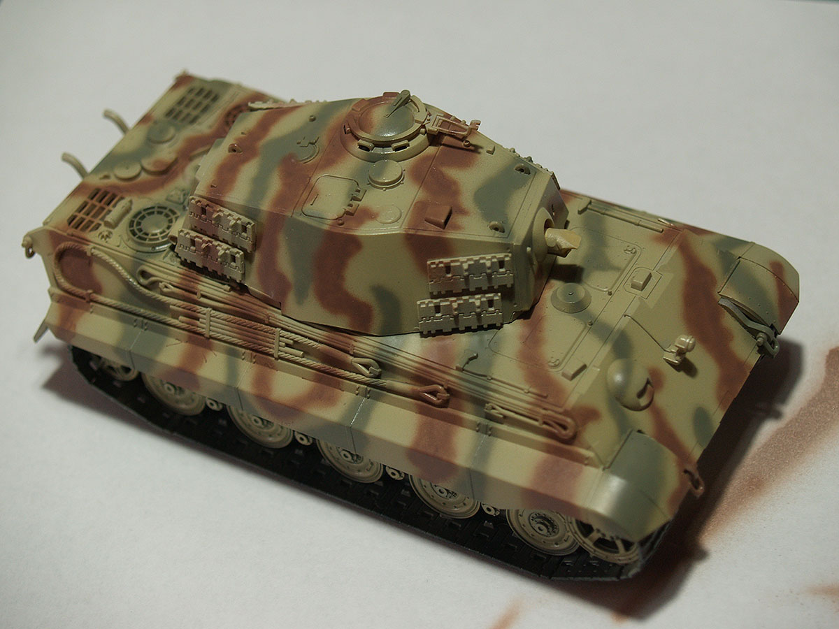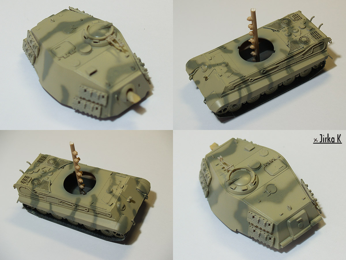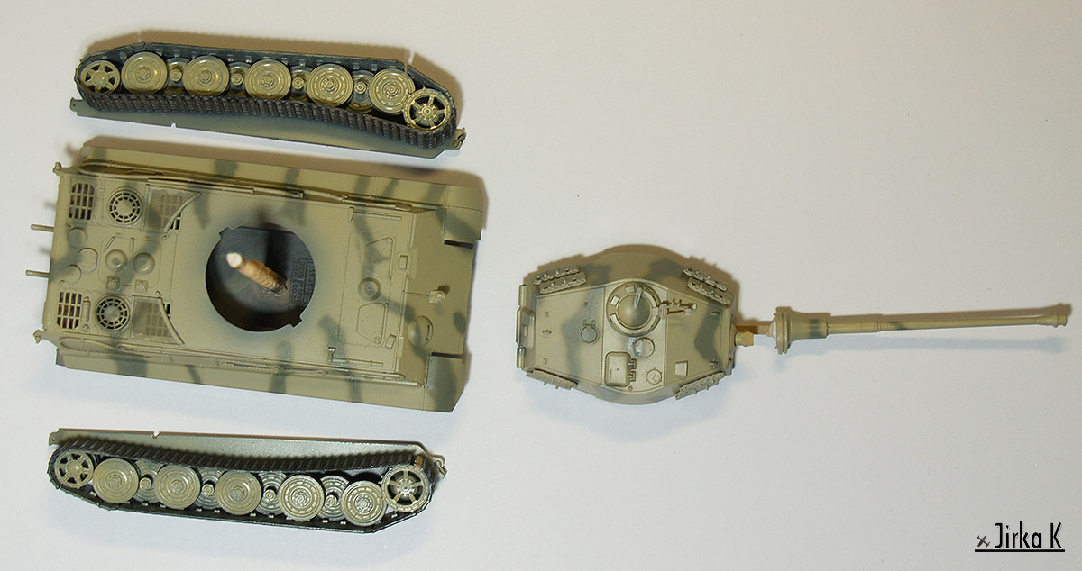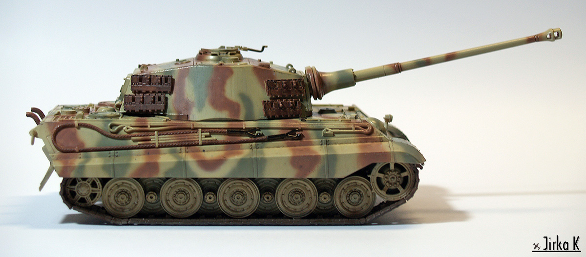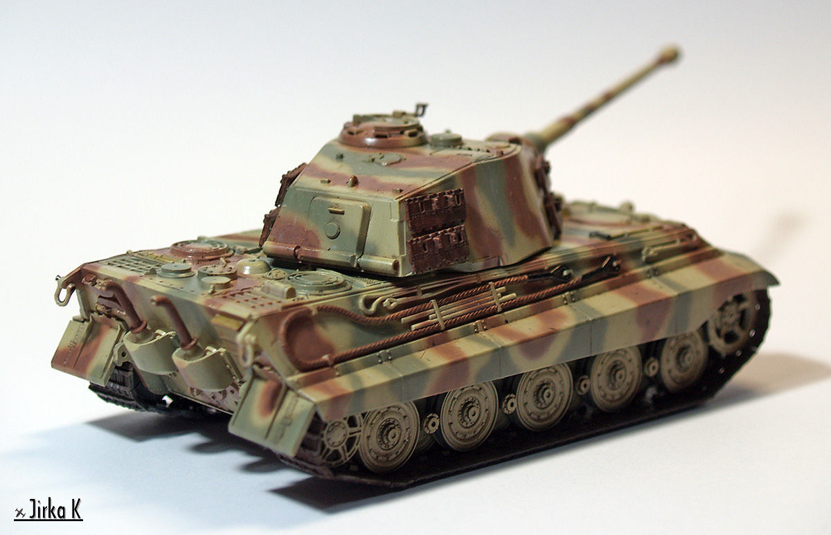 Asi jsem dokončil Königstigera, Revell 1/72 Tohle je opravdu impozantní profil! Panzer VI B je nejkrásnější tank! Chybí ještě dolepit hever, kulomet a možná nějaké detaily. Na konci října jej vezmu na místní patlací seanci, kde jsou na techniku povolanější a nechám si naživo poradit, jak jej definitivně dorazit (chtělo by to minimálně nějakou podložku, protože se mi nepovedlo na levé straně ideálně spojit pásy).
