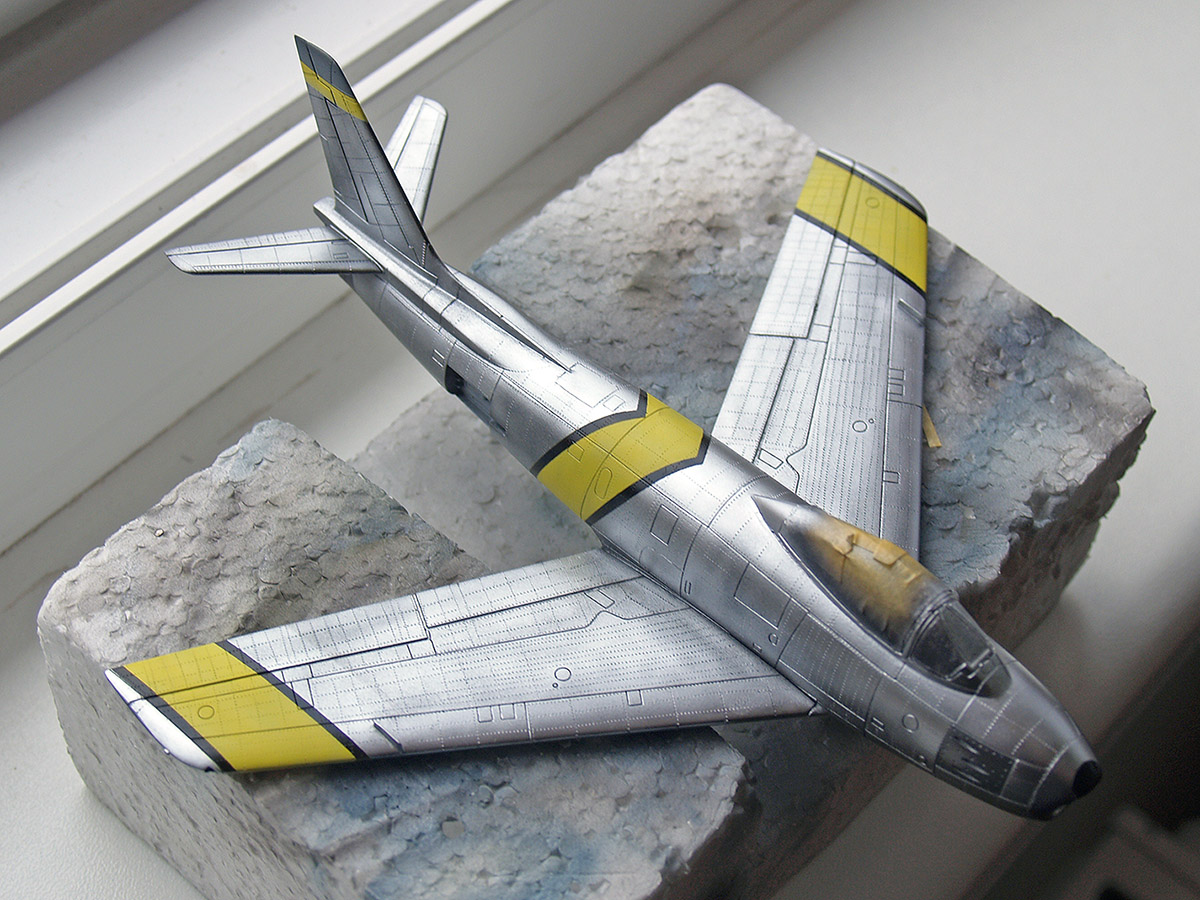 Tak jsem si trochu hrál s tím Sabrem. Zatím jen Gunze SM01 jako základ, Agama pasty na panel kolem kulometů (gun metal) a výtokové trysky (žíhaná ocel) a žlutá a černá místo velkoplošných obtisků.