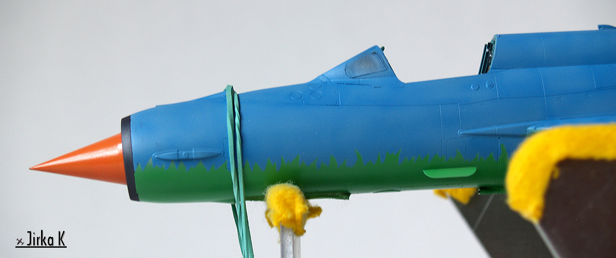 Prakticky všechny barvy jsou lihové Agamy, spodní zelená 19 L čistá, vrchní základ N5 M (RLM65) následně tónovaná čistou modrou a stříkáno nerovnoměrně, v několika různě tónovaných vrstvách. Snažil jsem se o ne úplně jednolitý povrch a docela se mi to líbí.