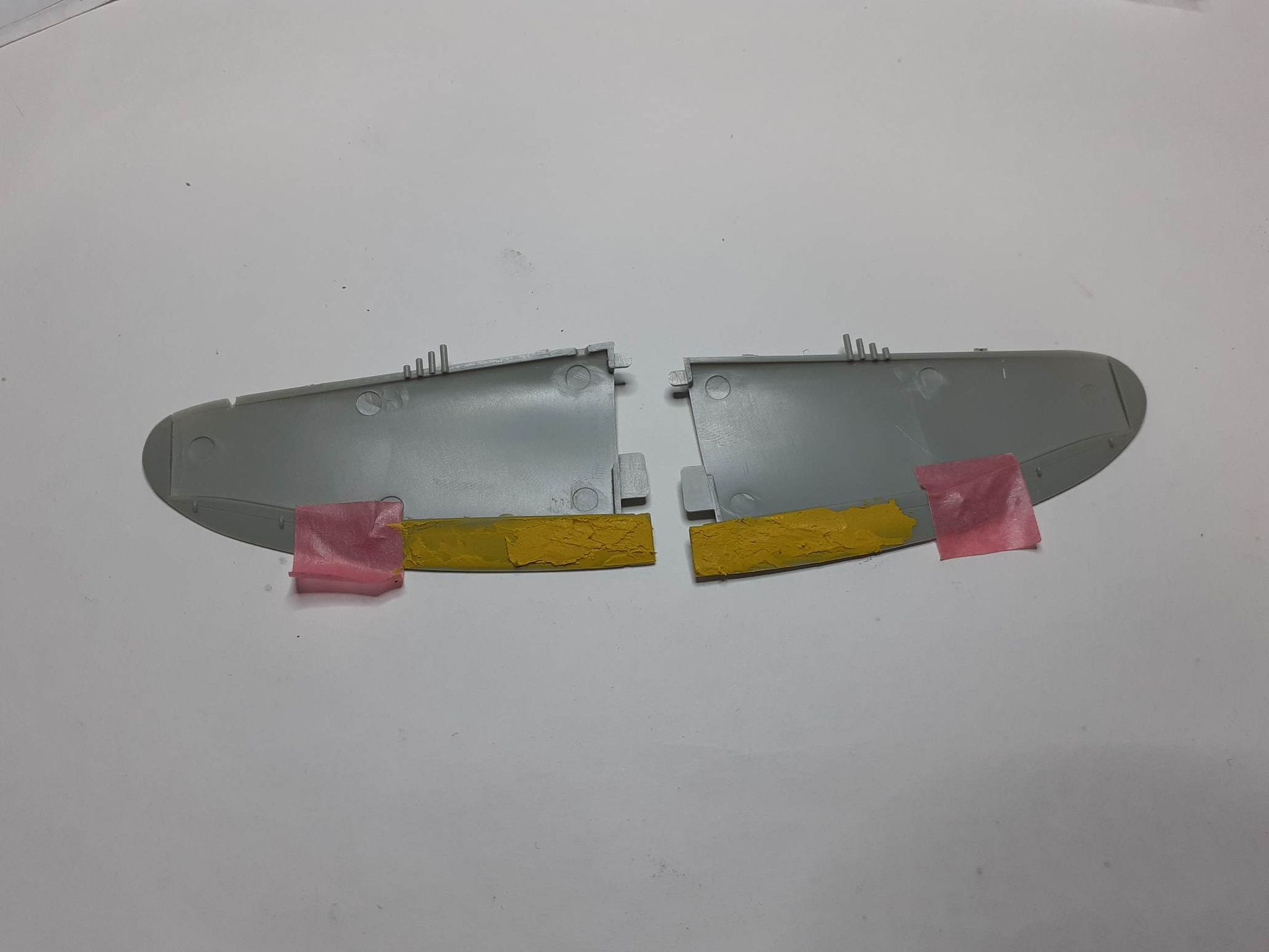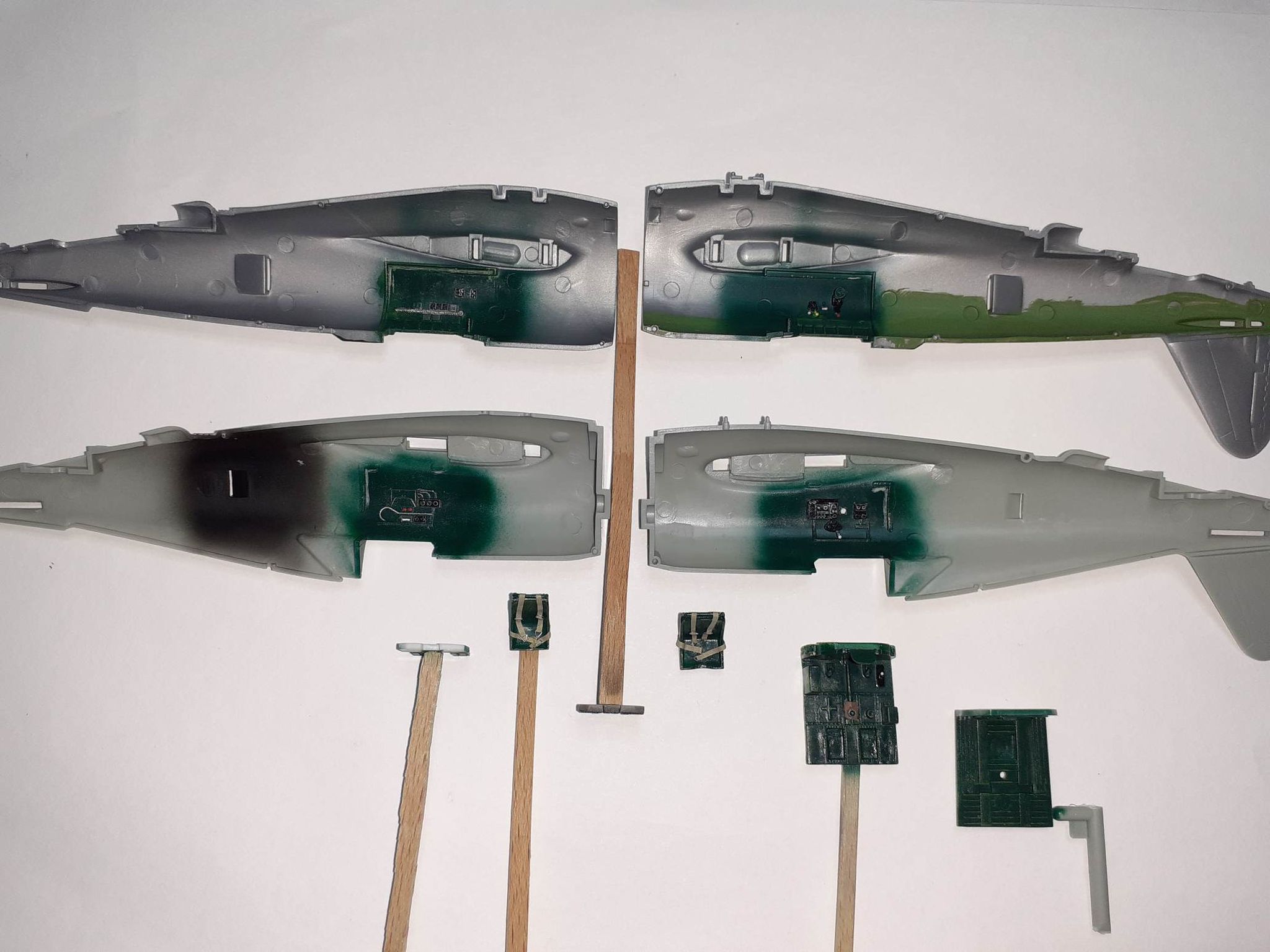 Po bližšom zoznámení sa s výliskami som ako prvé rozhodol zamáznuť polyesterovým tmelom od Tamiye dve škaredé prepadliny na spodnej časti krídla, na vztlakových klapkách. Okrem toho som aj pooddeľoval drobné súčiastky do kokpitu, pričom som zistil, že v stavebnici od Revellu mi chýba prístrojová doska. Takže ma čaká skrečnutie novej.
