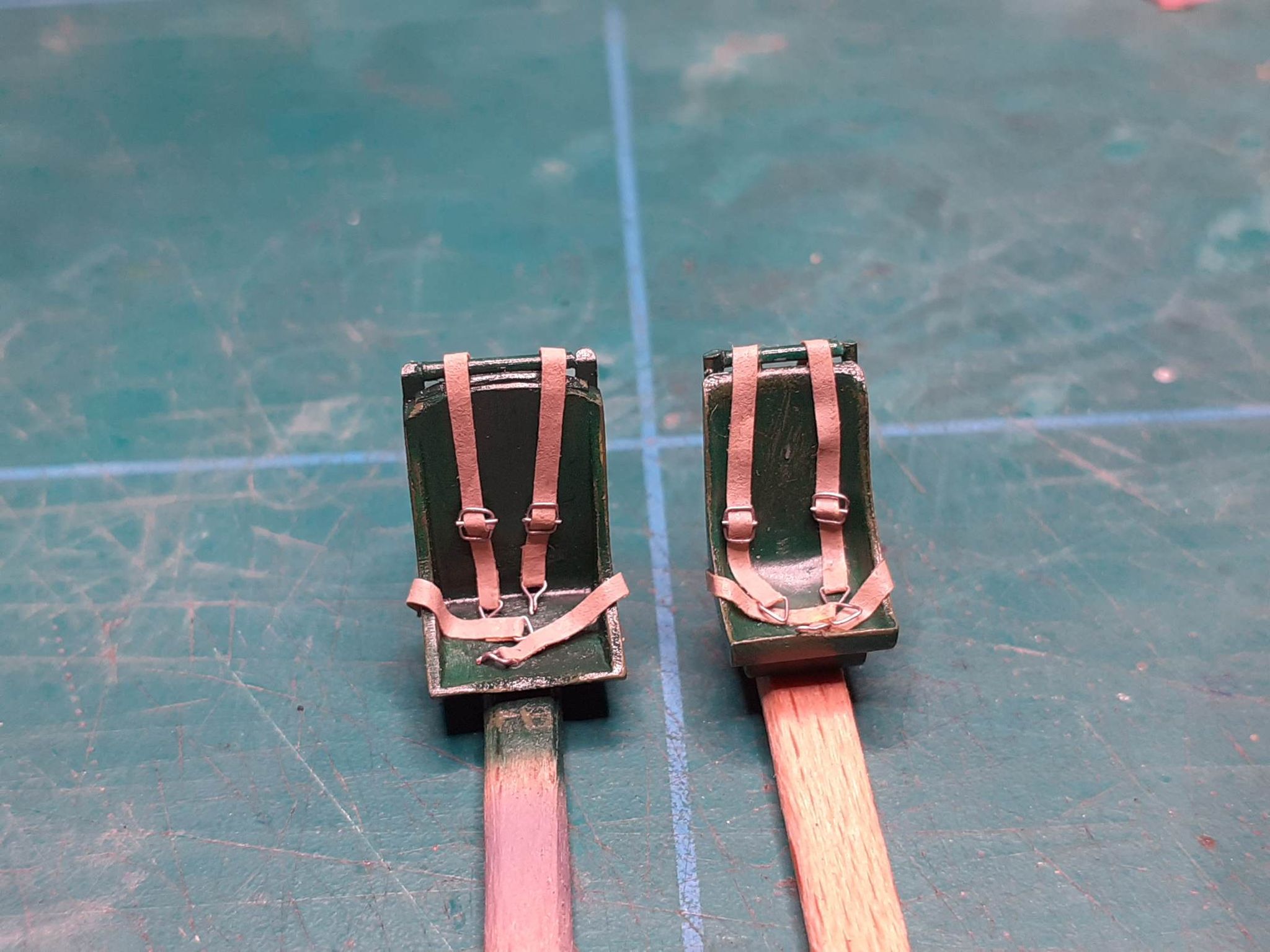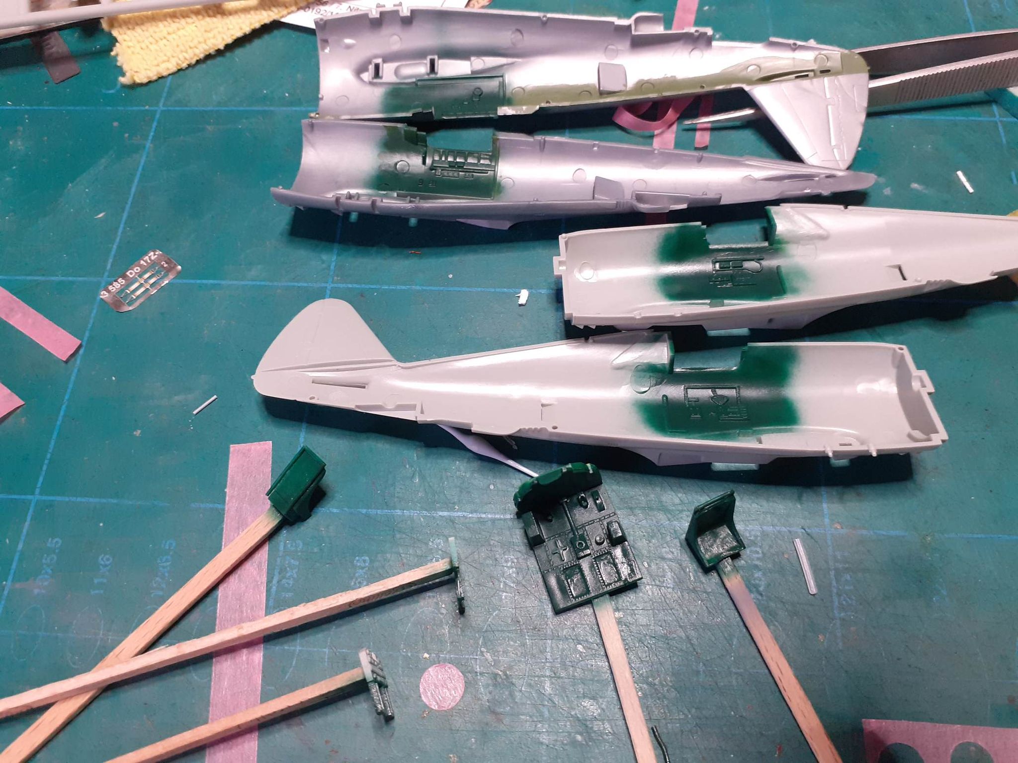 Niečo málo som na Thunderboltoch porobil - v prvom rade som vyrobil novú prístrojovú dosku do reveláckeho, keďže pôvodná sa asi premiestnila do paralelného vesmíru (načo mi tam budú dve...??? :grin: ). Namiešal som som približný odtieň do kokpitu a nastriekal boky kokpitu a diely do kokpitu. Sedačky som predtým upravil, aby sa aspoň trochu podobali na tie skutočné. V prvom rade som ich kapánek stenčil (na reveláckom som odfrézoval aj predlisované pútacie pásy) , pridal náznak rúrkovej konštrukcie na zadnú stenu a hlavne nápadnú hrazdičku na vrch, cez ktorú viedli ramenné pásy. Nakoniec som ešte tie sedačky vybavil pásmi.