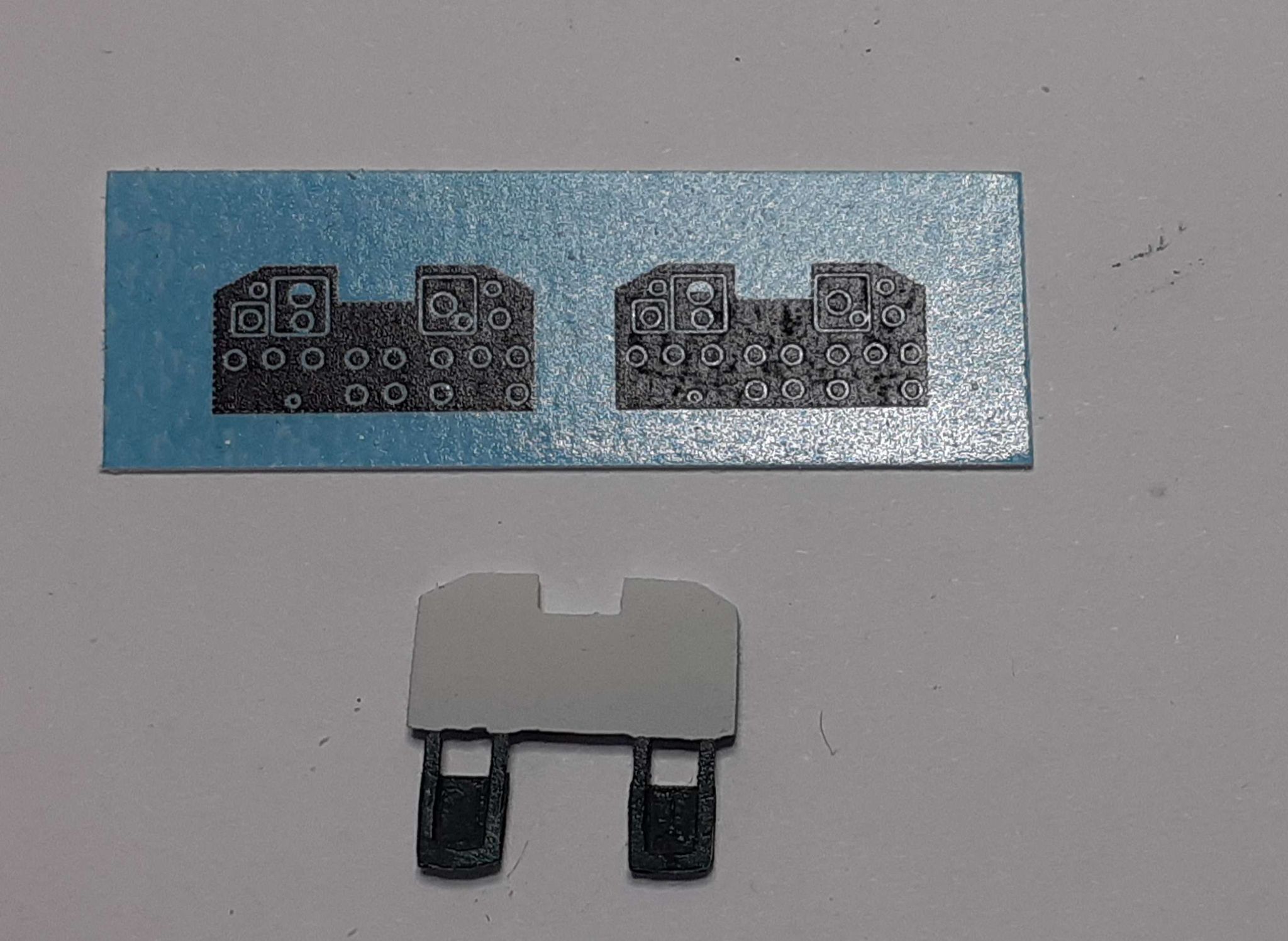 Dnes ma už tak neboleli oči, tak som v posledný deň dovolenky dokončil skrečovanú prístrojovú dosku. Dokončil som kresbu prístrojovky v Coreli, vytlačil ju na kúsok dekálového papiera, prelakoval a po zaschnutí laku nalepil na bielo nastriekanú plochu prístrojovky. Výsledok je do zavretého kokpitu uspokojivý.