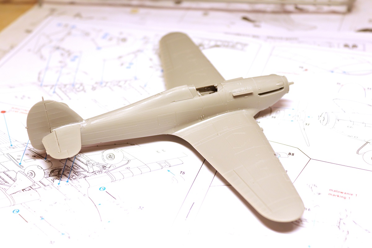 Koukám, že Mk.II je uživatelsky přívětivější a podvozek se lepí klasicky. U Mk.1 lepí do podvozkové šachty přilepené k vrchní části křídla a až poté se nasadí přes nohy a přilepí spodní část křídla. Pro mne úplně blbé, ještě, že nohy jsou zasazeny celkem napevno. Ale budu rád, když si je při manipulaci s modelem neulomím.
