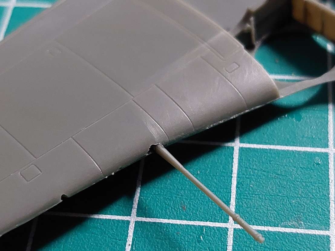 V křídle jsou zevnitř připravené na vyvrtání 2 díry, no myslel jsem že to je pro usazení těch boulí, omyl, díry jsou úplně mimo proti kolíčkům a na povrchu výlisků není ani náznak, kde si případně otvor navrtat a kam vlastně ty boule umístit. Usadil jsem je dle paneláže, ta by měla překrývat linku na boulích. Opět ouha, paneláž na boulích vede úplně šejdrem, takže narýt znova a původní zatmelit. Jestli já se neměl radši srát s RS.