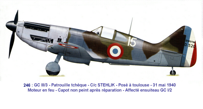 PS: Předpokládám, že si Stehlík i díky svým zkušenostem vysloužil pozici zkušeného pilota, který létal s opravenými letadly u jednotky. To by i mohlo vysvětlit, proč zrovna on létal s opravenou D.520. Stehlík totiž, když si přebíral v Toulouse fungl novou D.520(po přezbrojování jednotky z MS-406), aby jí přelítnul k jednotce, tak hned po vzletu jeho letounu vybouchl motor a on se mistrně vrátil na tovární letiště a přistál. Za tento kousek mu ředitel továrny Dewoitine nabídl místo zalétávajícího pilota, což Stehlík odmítl a radši se vrátil ke svým kamarádům u jednotky.