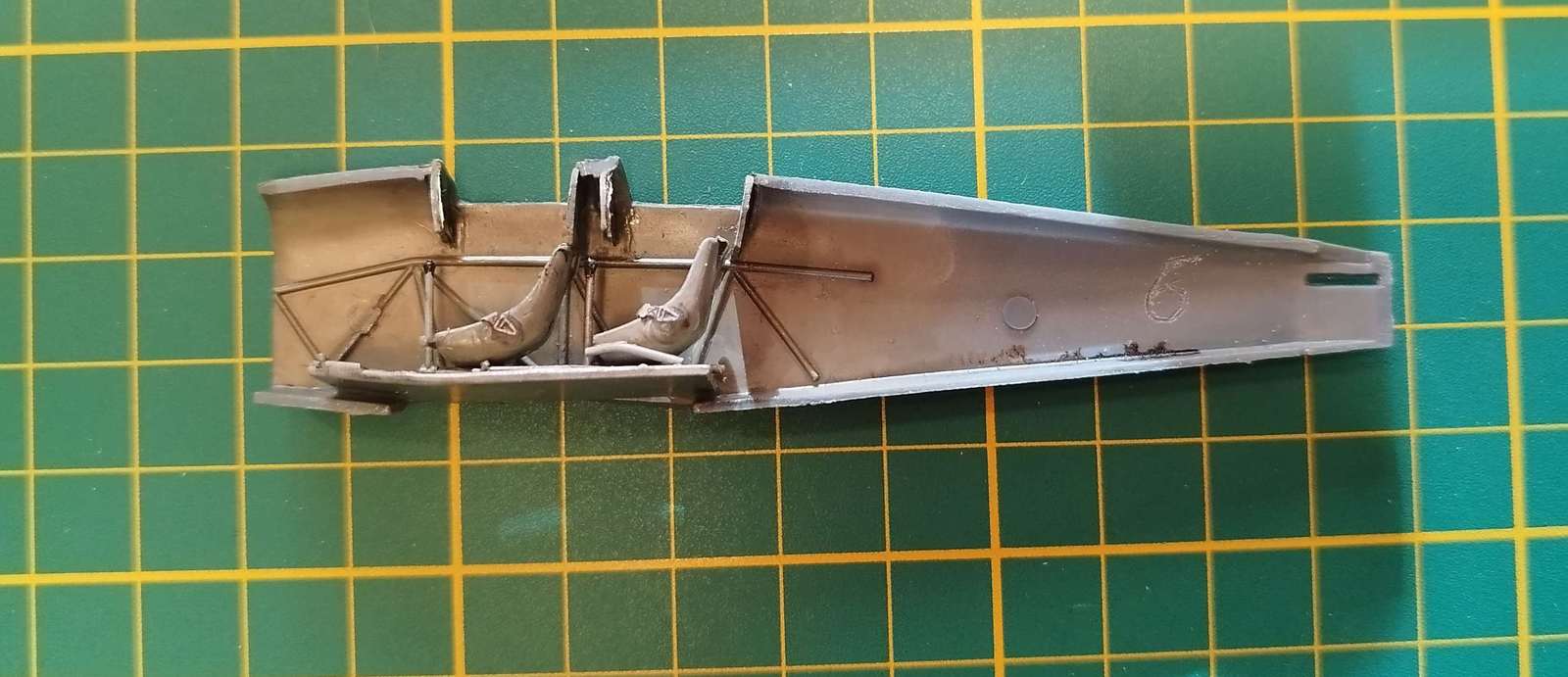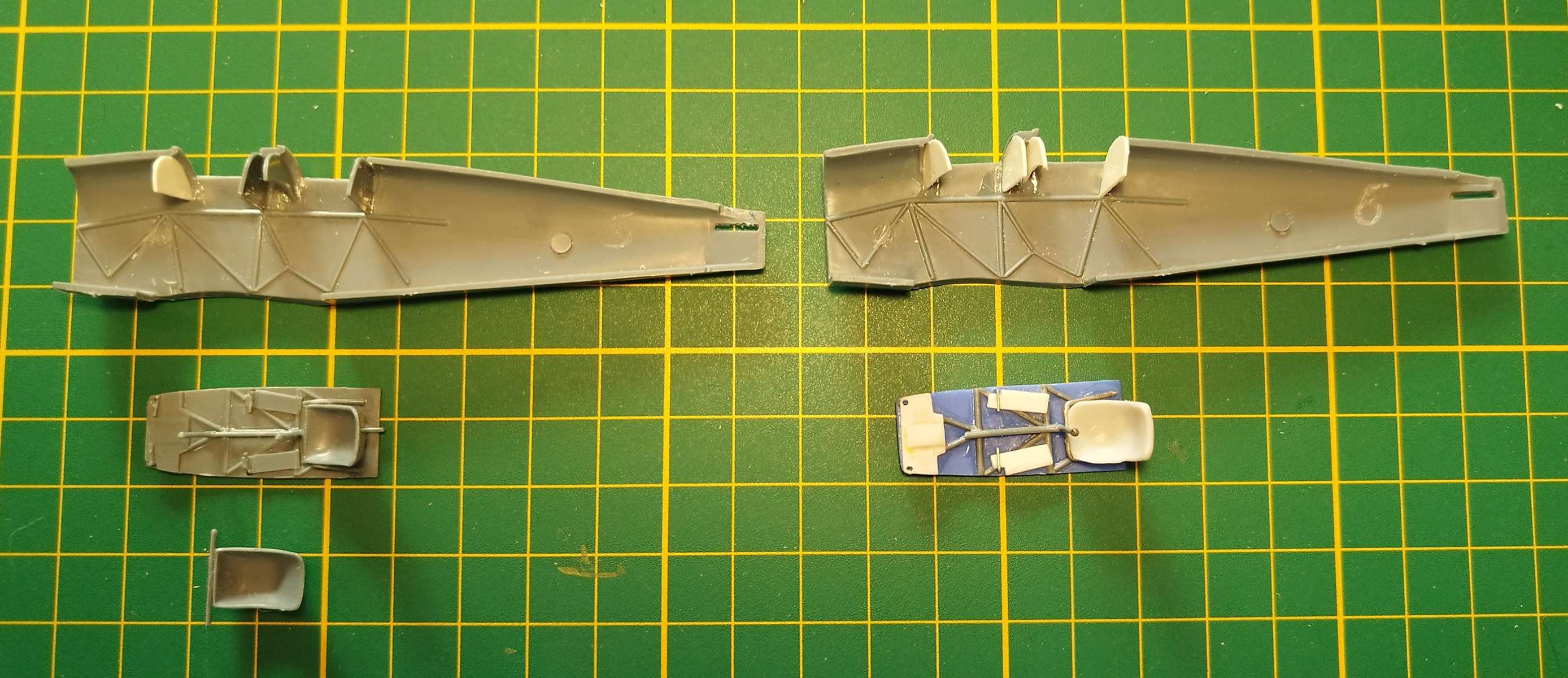 Jednak nám návod nijak nepomůže a polohu (např. a nejen) kniplů je nutné kvalifikovaně odhadnout (pomohl návod od dvaatřicetiny ICM), druhak už při zkusmém přiložení sedaček zahlodal červíček pochybnosti - vejde to tam vůbec? Vlepil jsem do trupu zadní přepážky kokpitu a základy palubek, a pochybnost se potvrdila - při slícování podlahy "trubka na trubku" vycházely kniply ZA palubky :cry: Takže mám přilepenou zadní sedačku (co nejblíž kniplu) a po nabarvení to tam "nějak" narvu a doplním přední sedačkou...