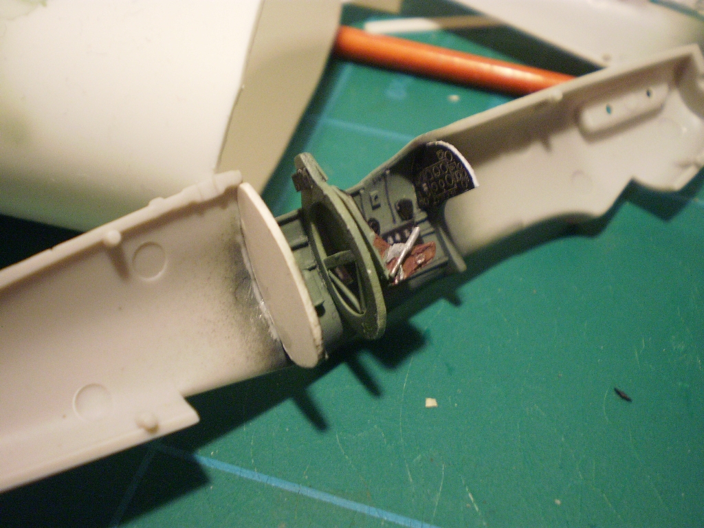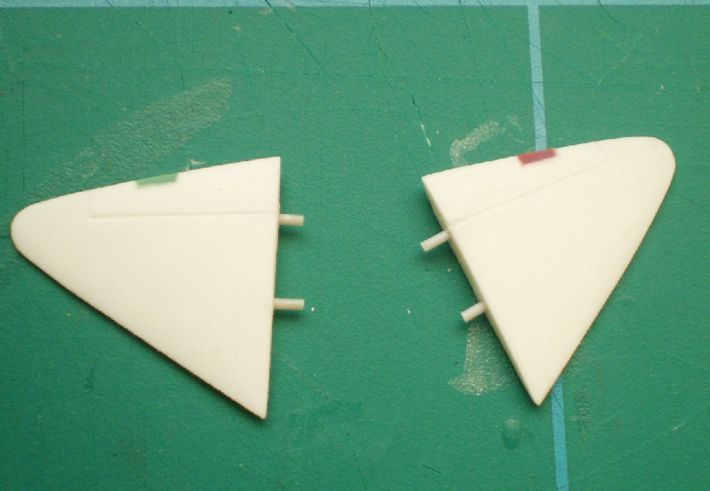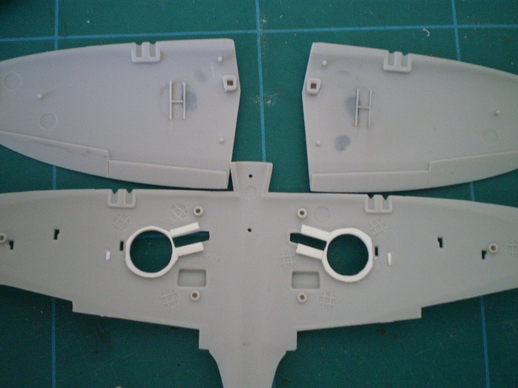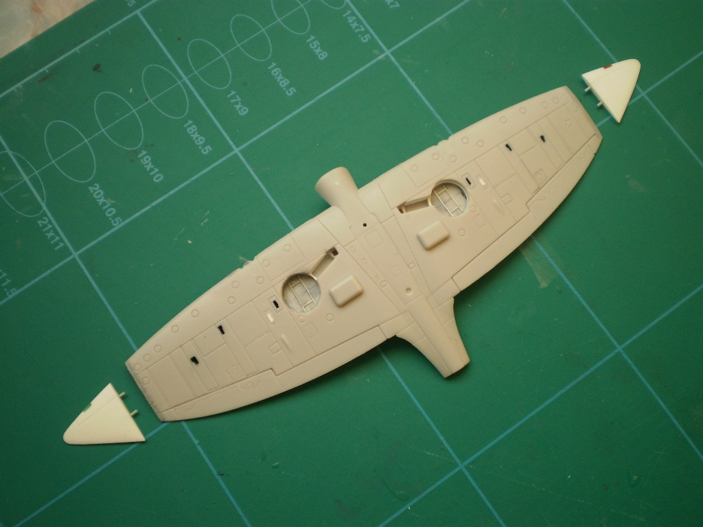 Celé som to začal doplnením podvozkových šachiet a prestavbou krídiel do podoby štandardu sedmičky so zahrotenými koncami. Pôvodne som chcel použiť predĺžené konce z KP, ale po odrezaní oblúkov z airfixu som zistil, že nesúhlasia profily, pretom som z 2mm hrubej doštičky vybrúsil nové "špičky". Takto som aspoň do nich vlepil aj pozičné svetlá zo zbytkov jednorázového zapalovača. Zároveň som obrúsil z povrchu krídla kvapkovité výstupky nad podvozkovou šachtou a v šachte som naopak zatmelil vyhĺbenie.