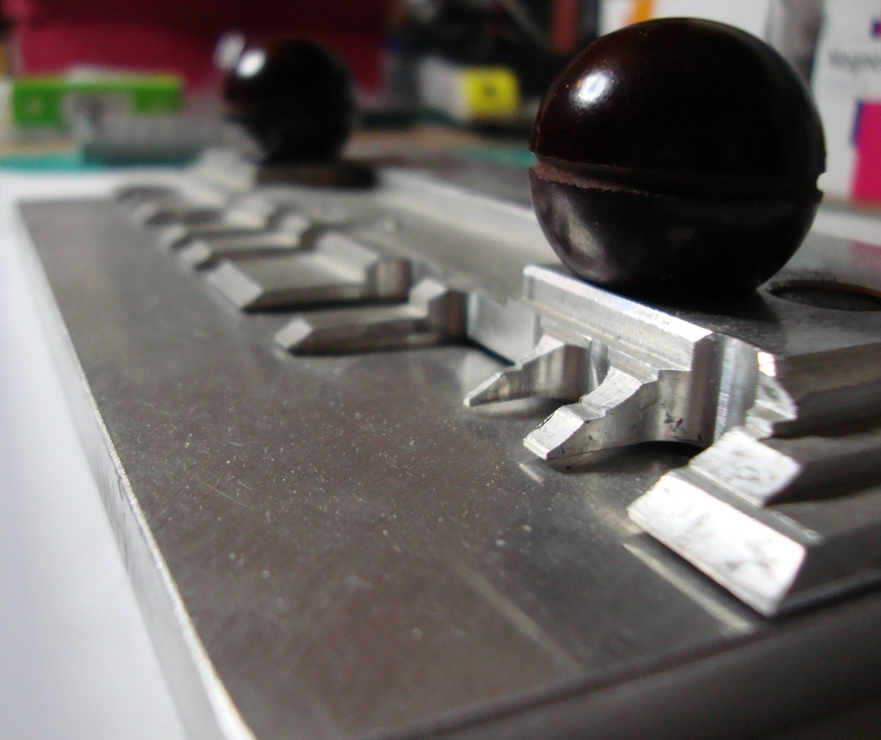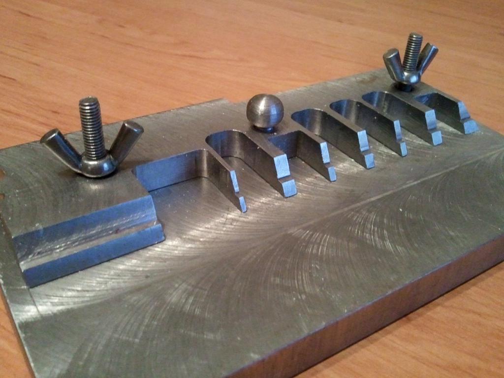 Tak jsem slíbil, že jsem dám svůj "ohýbací" nástroj...tak plním slib. Je to po domácku udělaná ohýbačka z pořádného kusu oceli, těžkého jako kr..o:)slouží mi i jako malý svěrák, když potřebuji něco malého brousit ci upravit do tvaru, tak to přichytím a můžu dělat. Je velice praktická na ohýbání ruzných tvarů leptů díky ruzně zvolených roztečí trnů a hran...spokojenost....ale jak říkám,,váží hodně..o:))) p.s. Když někdo bude chtít plánek, aby si ji třeba mohl udělat buďto z oceli nebo třeba z duralu na NC..není problém ho poslat. ;)