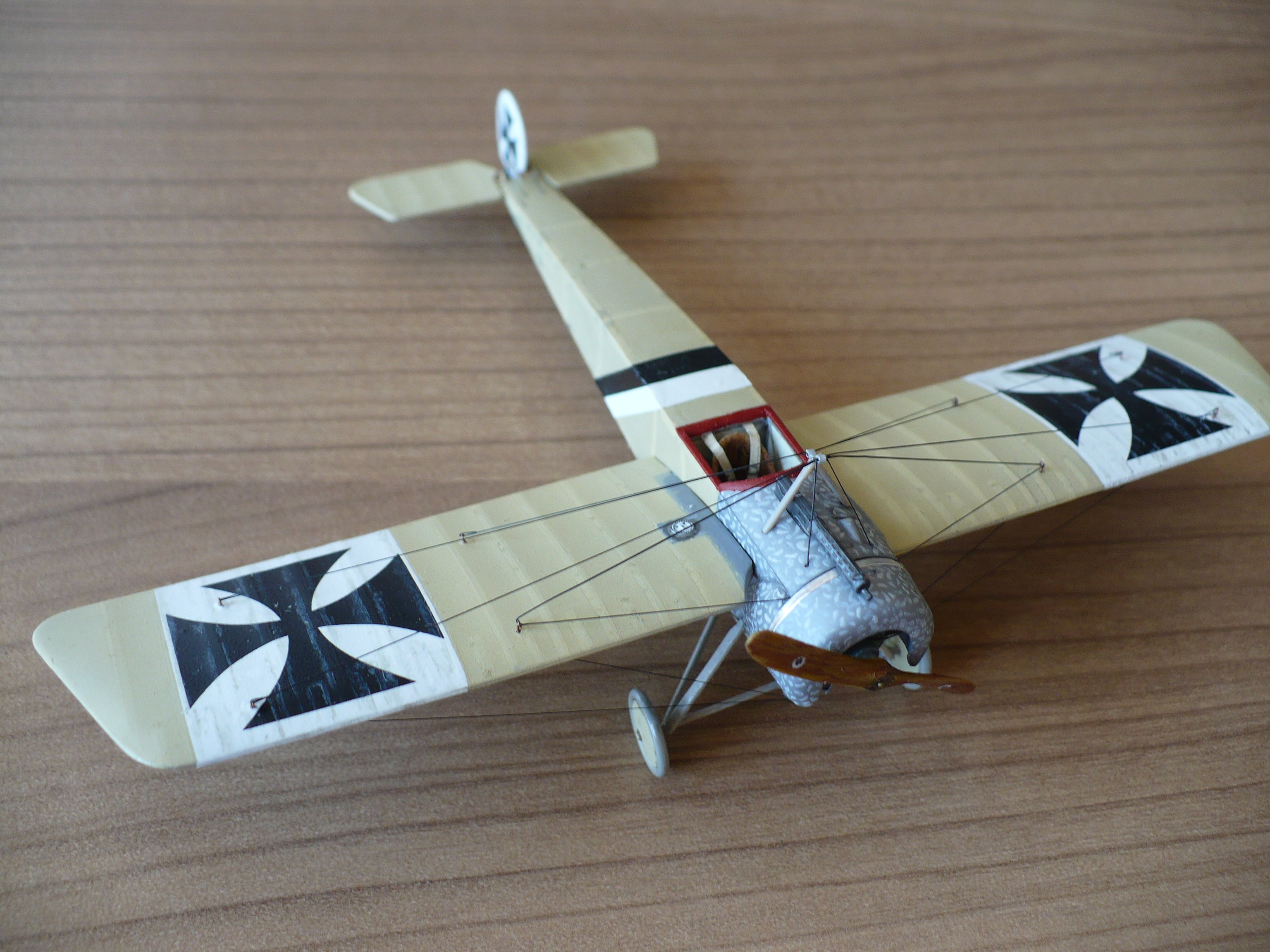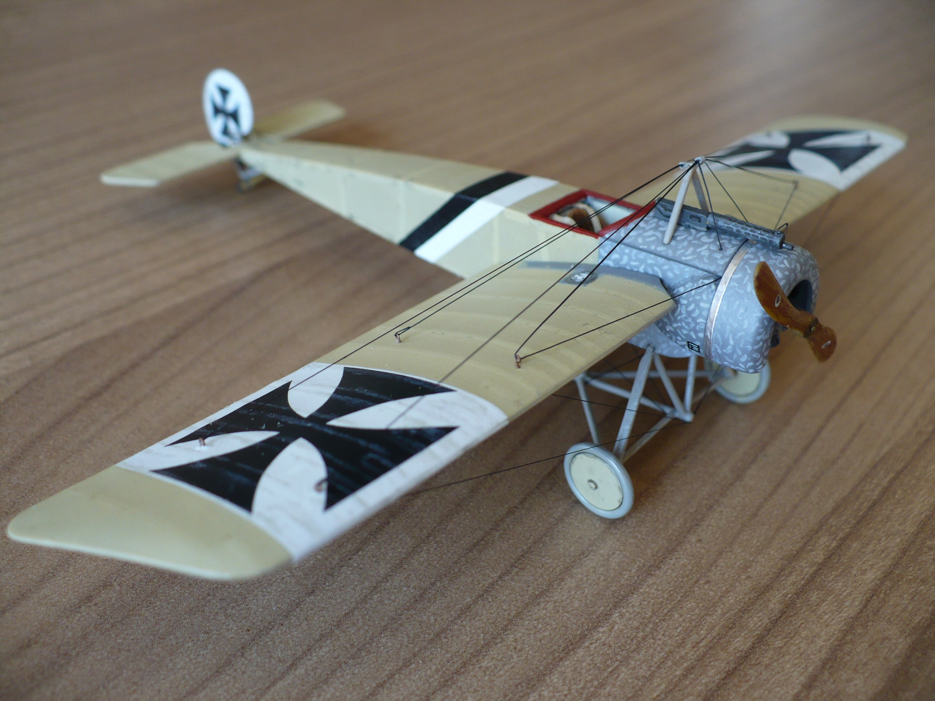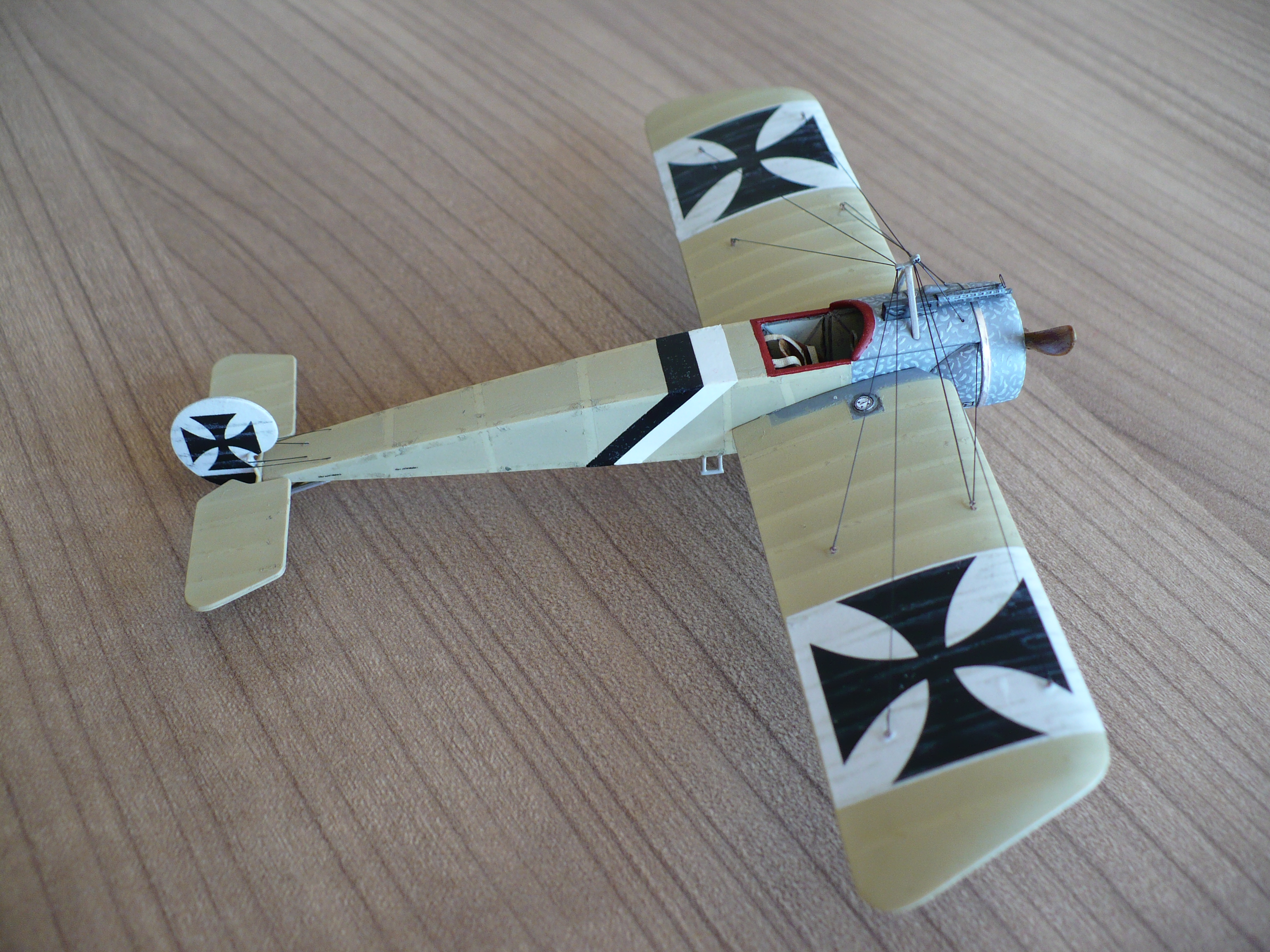 V pytlíku byla kamo na stroj E. Udeta, ale pro něj mám rezervován jeden ze čtvrtkových Fokkrů D. VII a tak jsem se musel poohlídnout jinde. V úvahu pro mě přicházel pouze Josef Jacobs, nebo Max Immelmann. Při pátrání v podkladech jsem narazil na nádherný Jacobsův Dr. I a tak bylo rozhodnuto, že eindecker dostane podobu stroje legendárního "Orla z Lille", Maxe Immelmanna. Zvolil jsem letoun E. I 13/15 s atraktivním černobílým pruhem na trupu. Tady jsem si ovšem řádně naběhl, protože tento letoun byl E. I z počátku produkce a oproti pozdějšímu E. III, který lze ze stavebnice postavit, měl řadu rozdílů. O jedno žebro menší rozpětí křídel, kratší trup, jinou kapotáž předku trupu atd... No abych to shrnul, na většinu rozdílů jsem se vykašlal, pouze jsem z devítiválcového motoru udělal sedmiválec (to platí i pro Udetův stroj), a smířil se stím že budu mít ve vitríně ne zcela košer zmenšeninu Maxova E. I 13/15. Ale pst.... nikomu to neříkejte