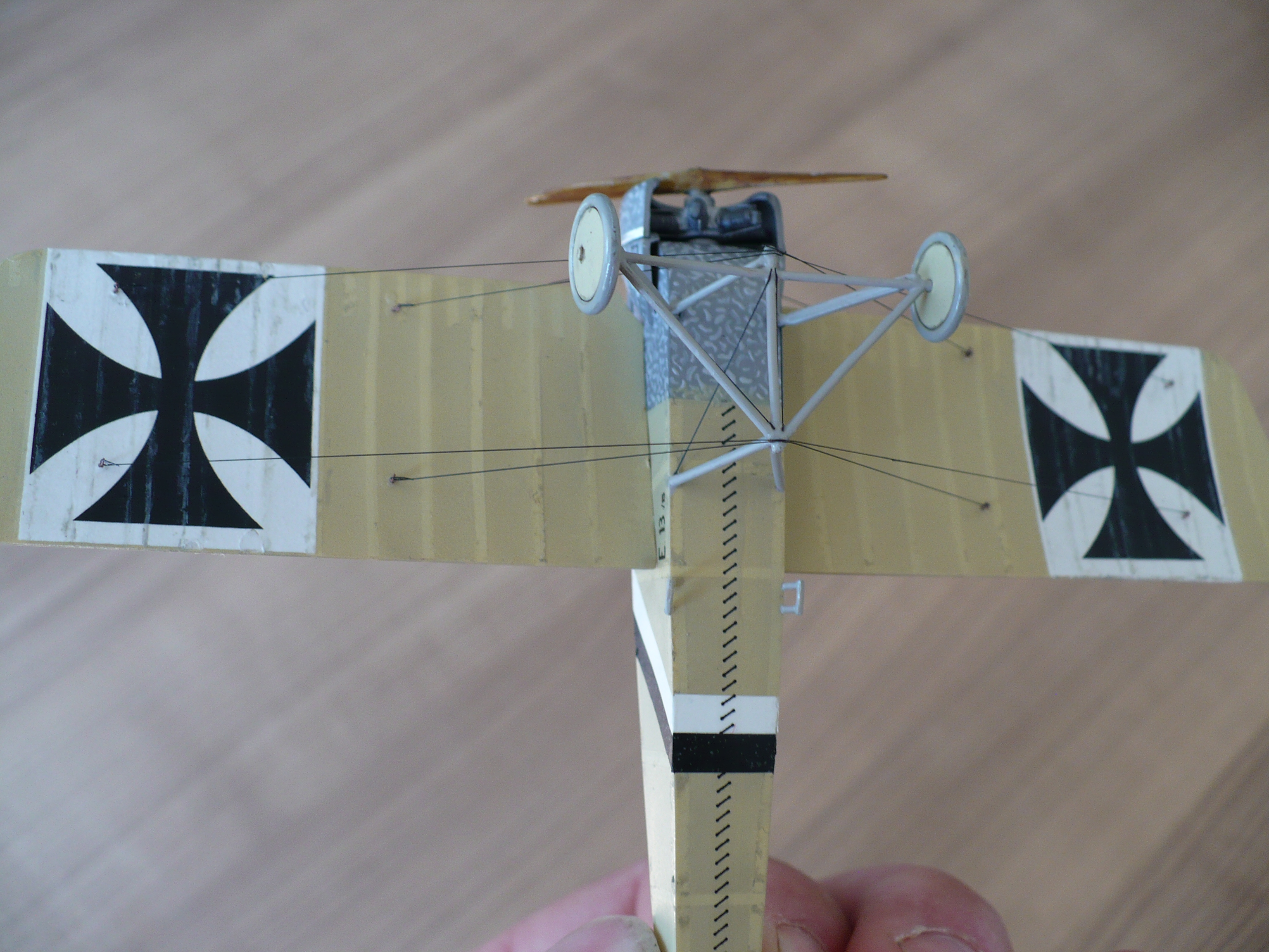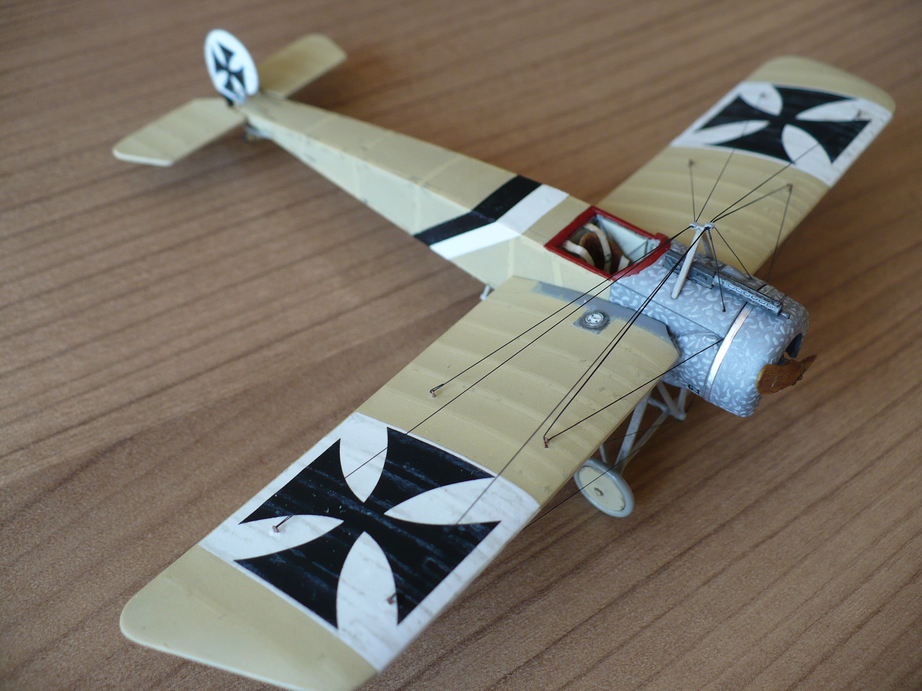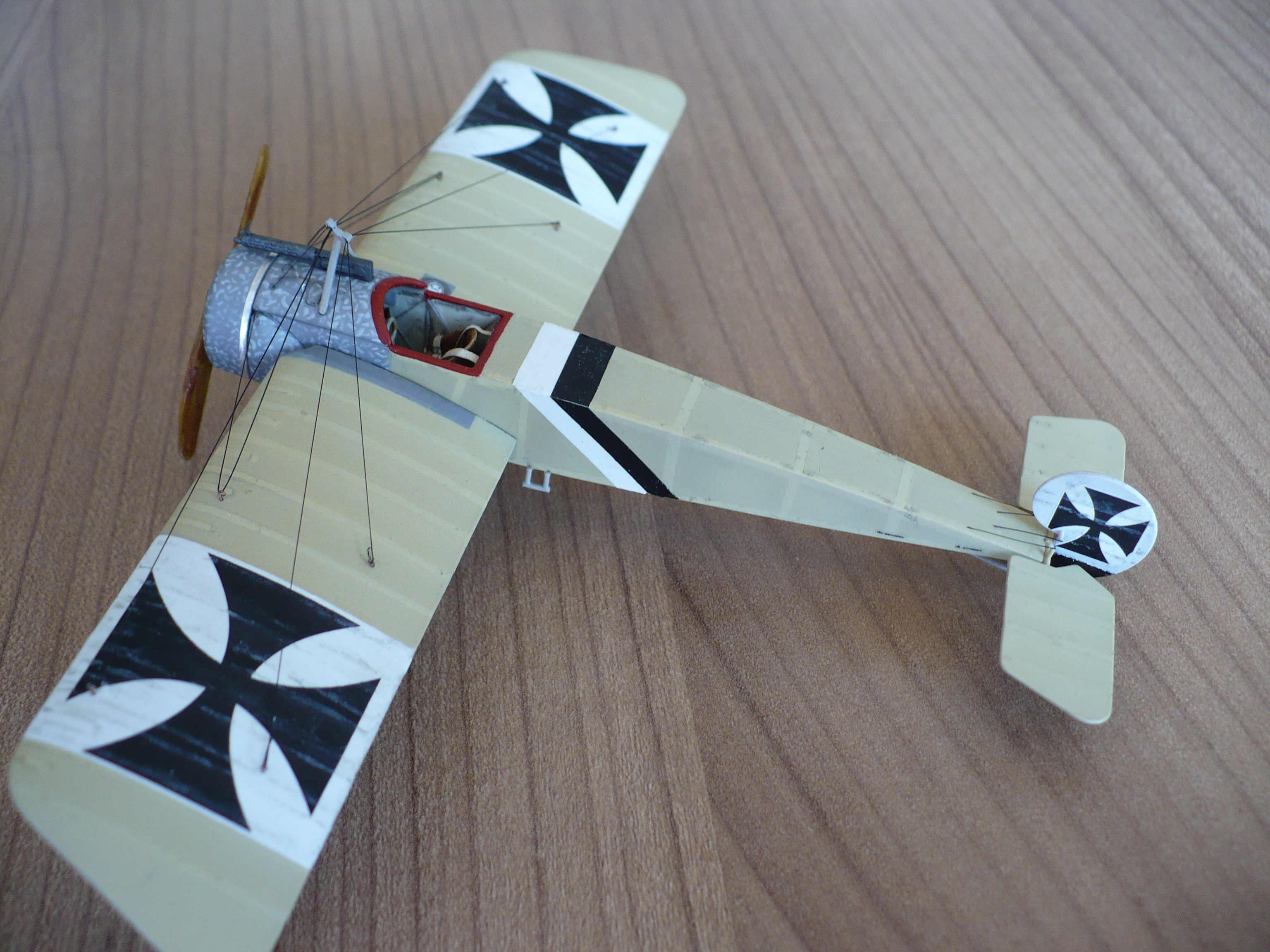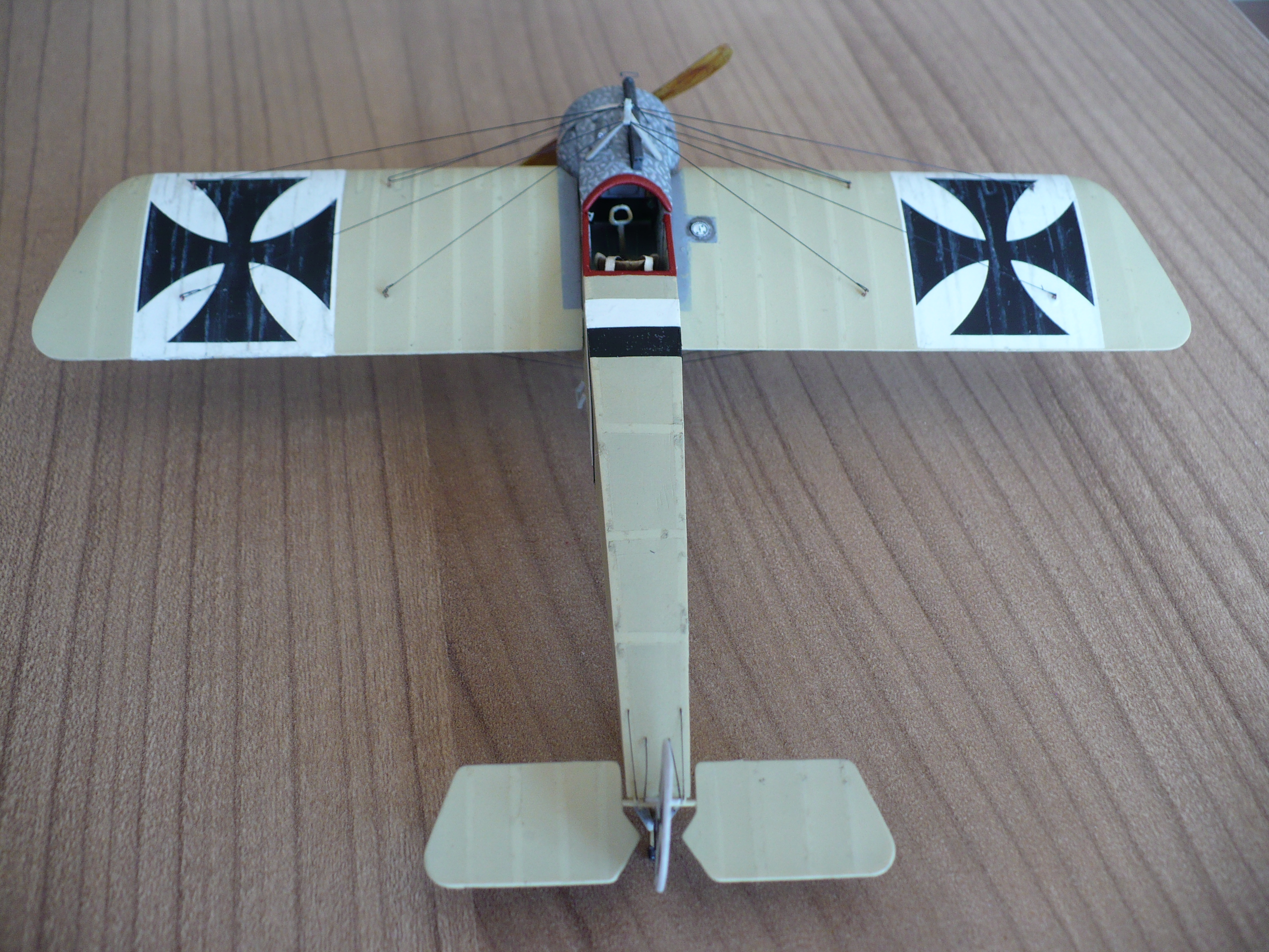 V pytlíku byla kamo na stroj E. Udeta, ale pro něj mám rezervován jeden ze čtvrtkových Fokkrů D. VII a tak jsem se musel poohlídnout jinde. V úvahu pro mě přicházel pouze Josef Jacobs, nebo Max Immelmann. Při pátrání v podkladech jsem narazil na nádherný Jacobsův Dr. I a tak bylo rozhodnuto, že eindecker dostane podobu stroje legendárního "Orla z Lille", Maxe Immelmanna. Zvolil jsem letoun E. I 13/15 s atraktivním černobílým pruhem na trupu. Tady jsem si ovšem řádně naběhl, protože tento letoun byl E. I z počátku produkce a oproti pozdějšímu E. III, který lze ze stavebnice postavit, měl řadu rozdílů. O jedno žebro menší rozpětí křídel, kratší trup, jinou kapotáž předku trupu atd... No abych to shrnul, na většinu rozdílů jsem se vykašlal, pouze jsem z devítiválcového motoru udělal sedmiválec (to platí i pro Udetův stroj), a smířil se stím že budu mít ve vitríně ne zcela košer zmenšeninu Maxova E. I 13/15. Ale pst.... nikomu to neříkejte