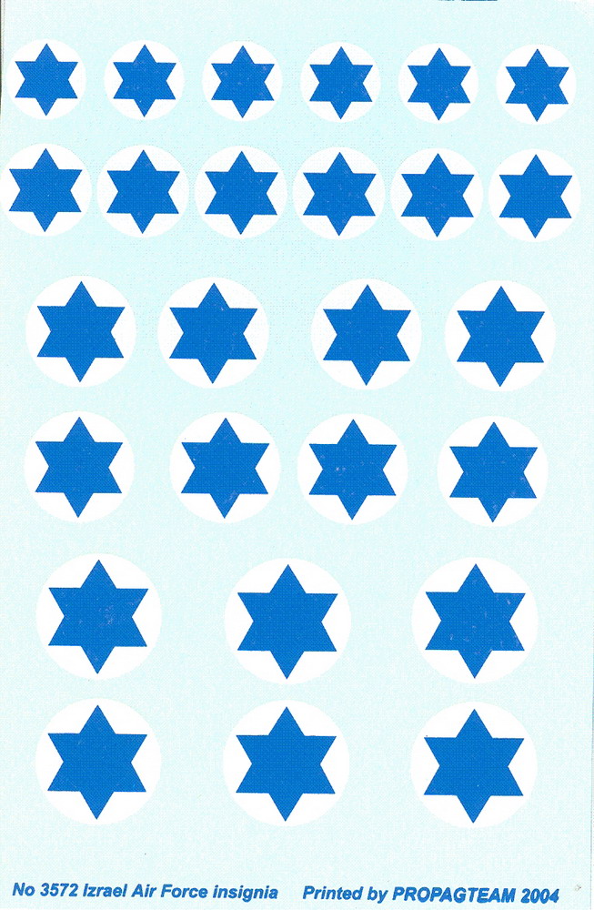 Prosím pomozte, nemá někdo volnej tenhle aršík obtisků od Propagteamu, jsou to izraelské znaky 1/72. Nutně sháním. Objednal bych přímo u nich, ale poštovný stojí víc než obtisky samotný. Případně, nemoh by to někdo pro mě někde koupit, u nás v Plzni je nemají.