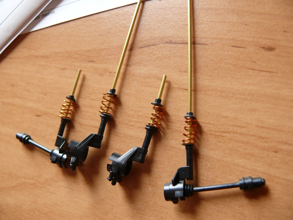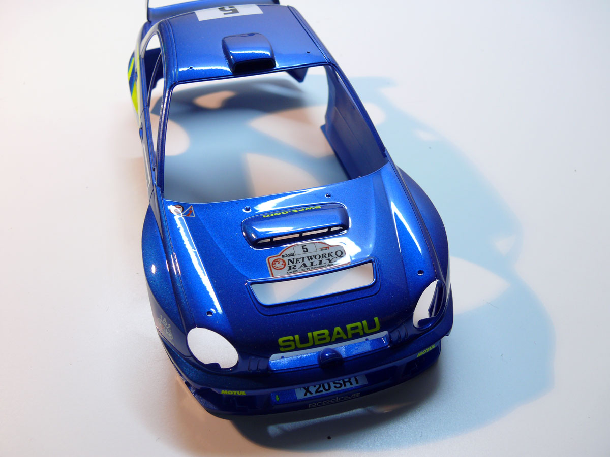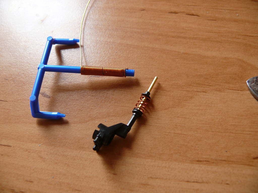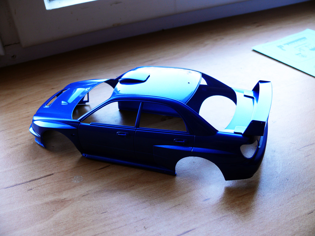 Tady je postup na tlumičích - přední budou trochu zmáčknutý a zadní malinko vysunutý: Další byla na řadě kastle - v barvě Zero Paints pro Imprezu - po prvních vrsvách laku (ještě ne 2K):