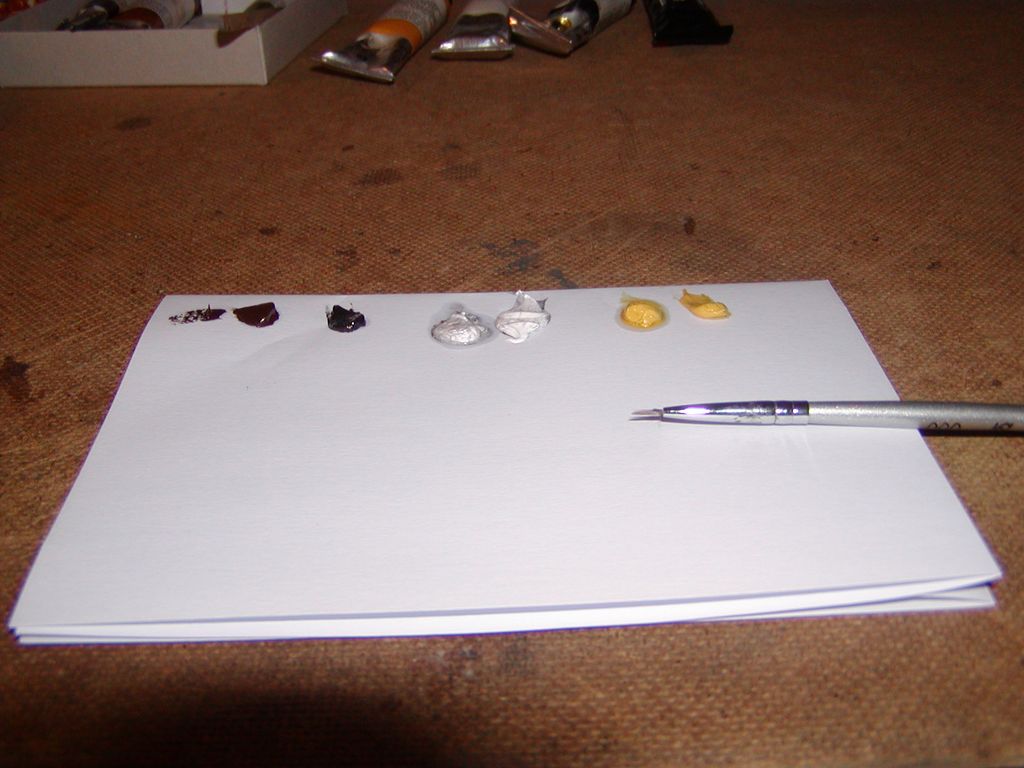 Na kousek plastové destičky(já jsem použil papír,důležité je aby materiál byl savý),si z tuby vytlačíme kousek olejových barev,které nijak neředíme.Odstíny volíme podle prostředí kde se vozidlo pohybovalo.Já jsem použil tyto odstíny: