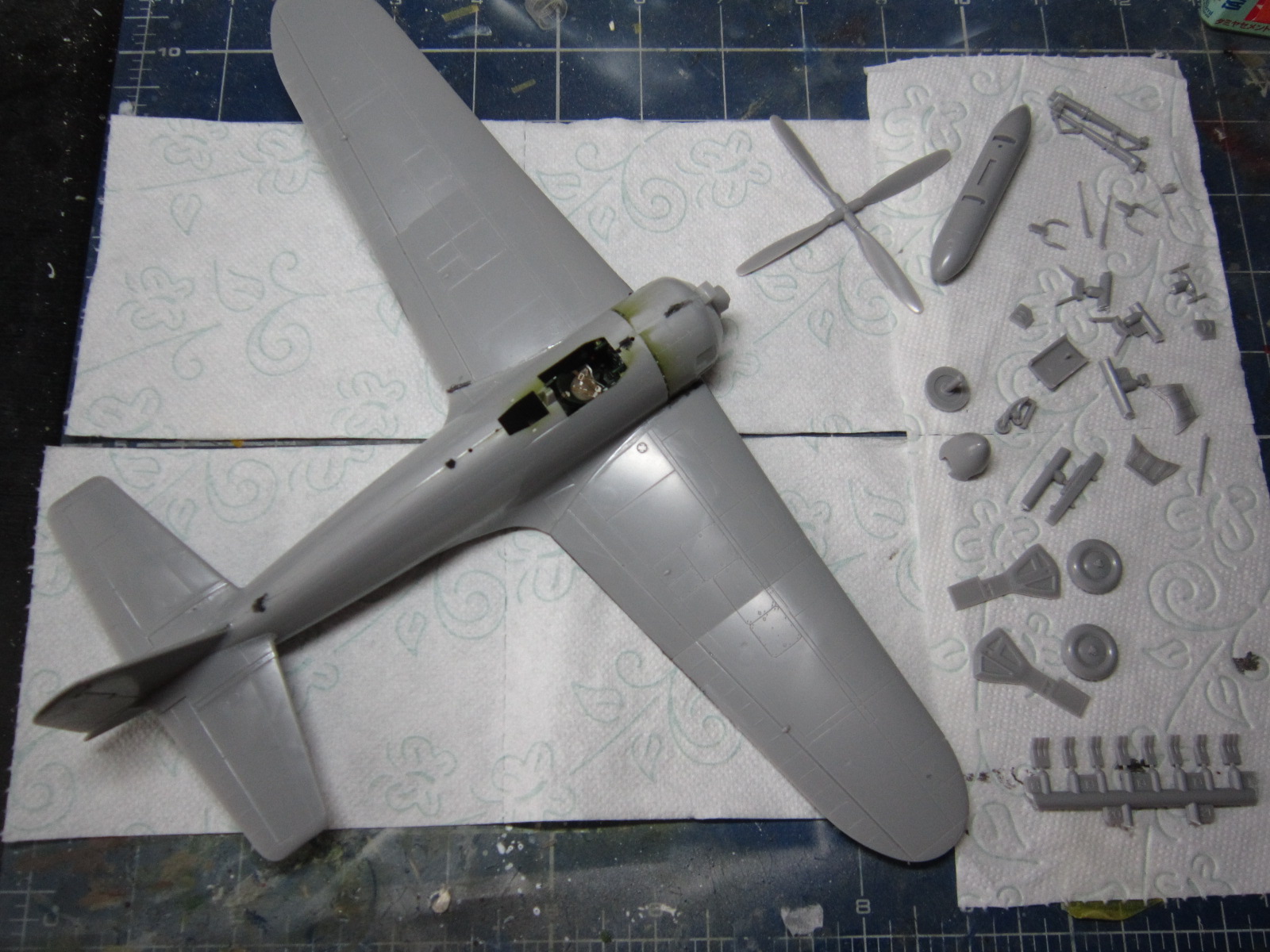 tak dame dalsi koblihu... ctvrtkovy Reppu od Finemolds. kokpit a hrubou stavbu jsem mel hotovy za 2 dny. po delsi dobe model, kterej nebudu muset skoro tmelit. drobny skviry jsem zalil cernym vterinakem a zacistim to debonderem. Jedina trochu vetsi komplikace byla, ze podlaha kokpitu narazela na sachty a branila tak presnymu usazeni trupu a kridel. podlahu jsem odfrezoval a dobry.