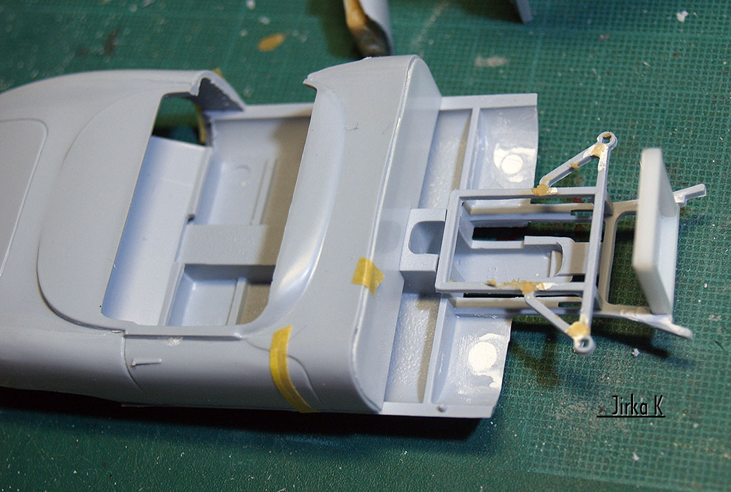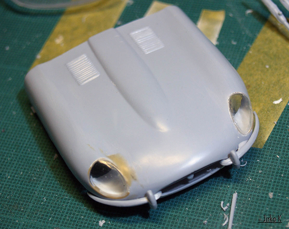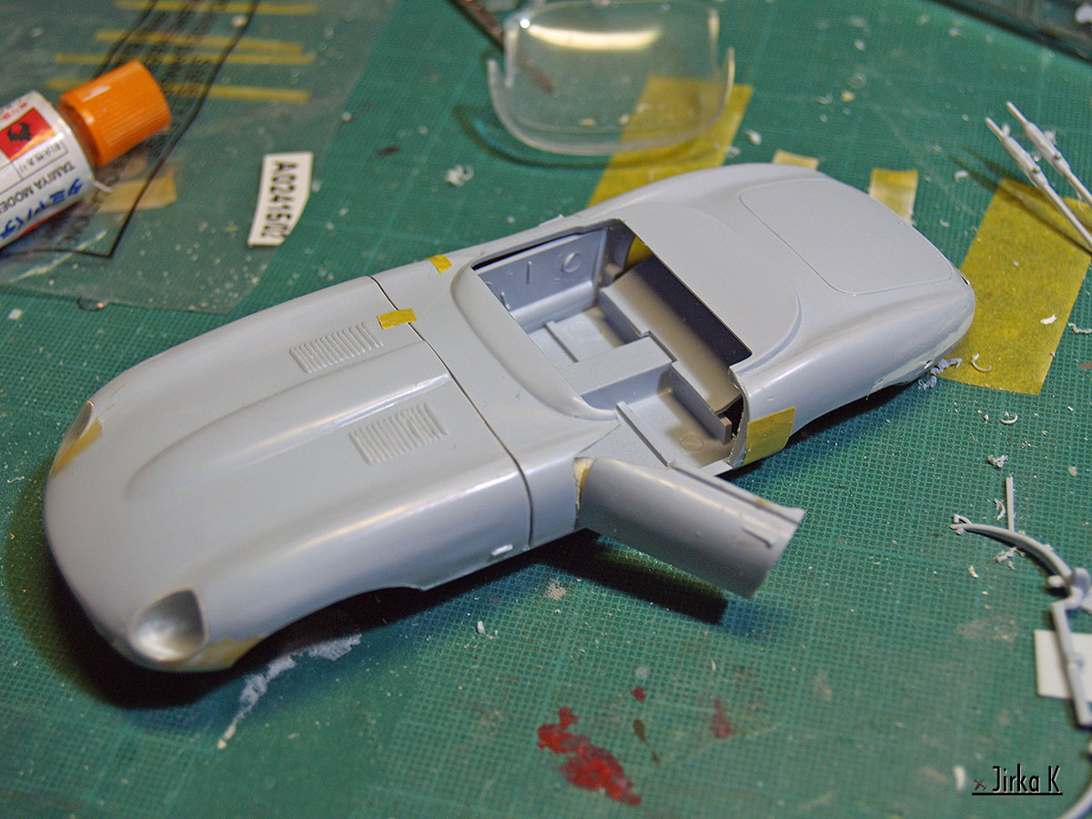 Jo, E-type je rozhodně nejkrásnější v kuse, proto přemýšlím, jak tu kapotu udělat funkční. Díky datu vzniku předlohy jsou všechny konstrukce opravdu jednoduché, takže by se to mohlo podařit, Přinejhorším bude nasazovací.