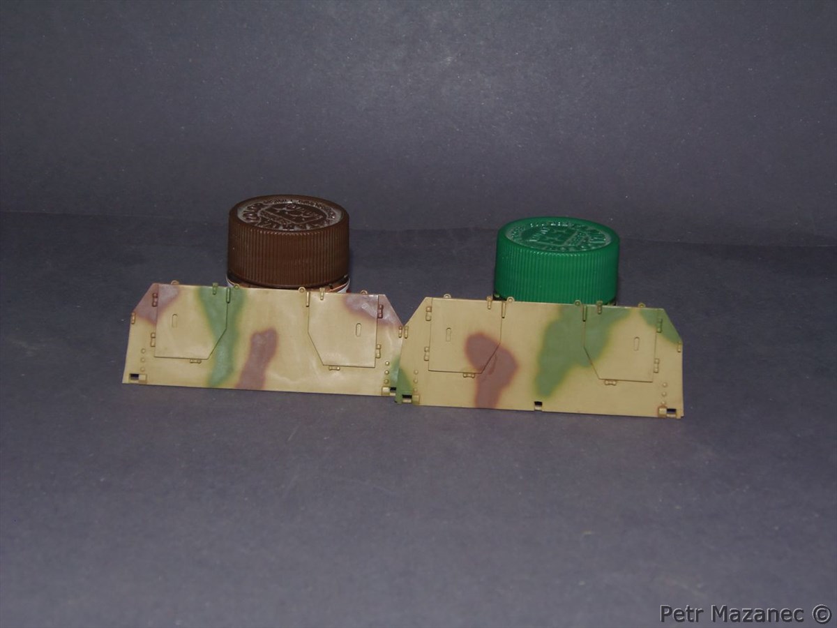 Nastříkaná kamufláž a Mobelwgen rozloženej na podsestavy po stříkání kamufláže, teď mě čeká oprava podfouknutých míst...