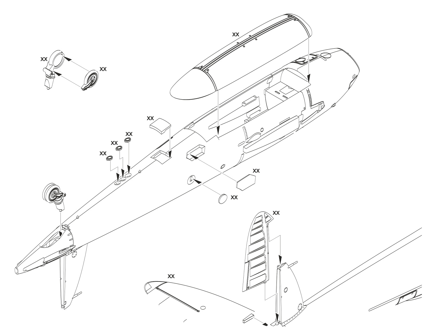 u Směru, když jsi to dobře slepil, tak se neklepal - hlavní kryt na nohu,na to ten malý úplně nahoru a přilepit celé ke křídlu..pak je to pevné