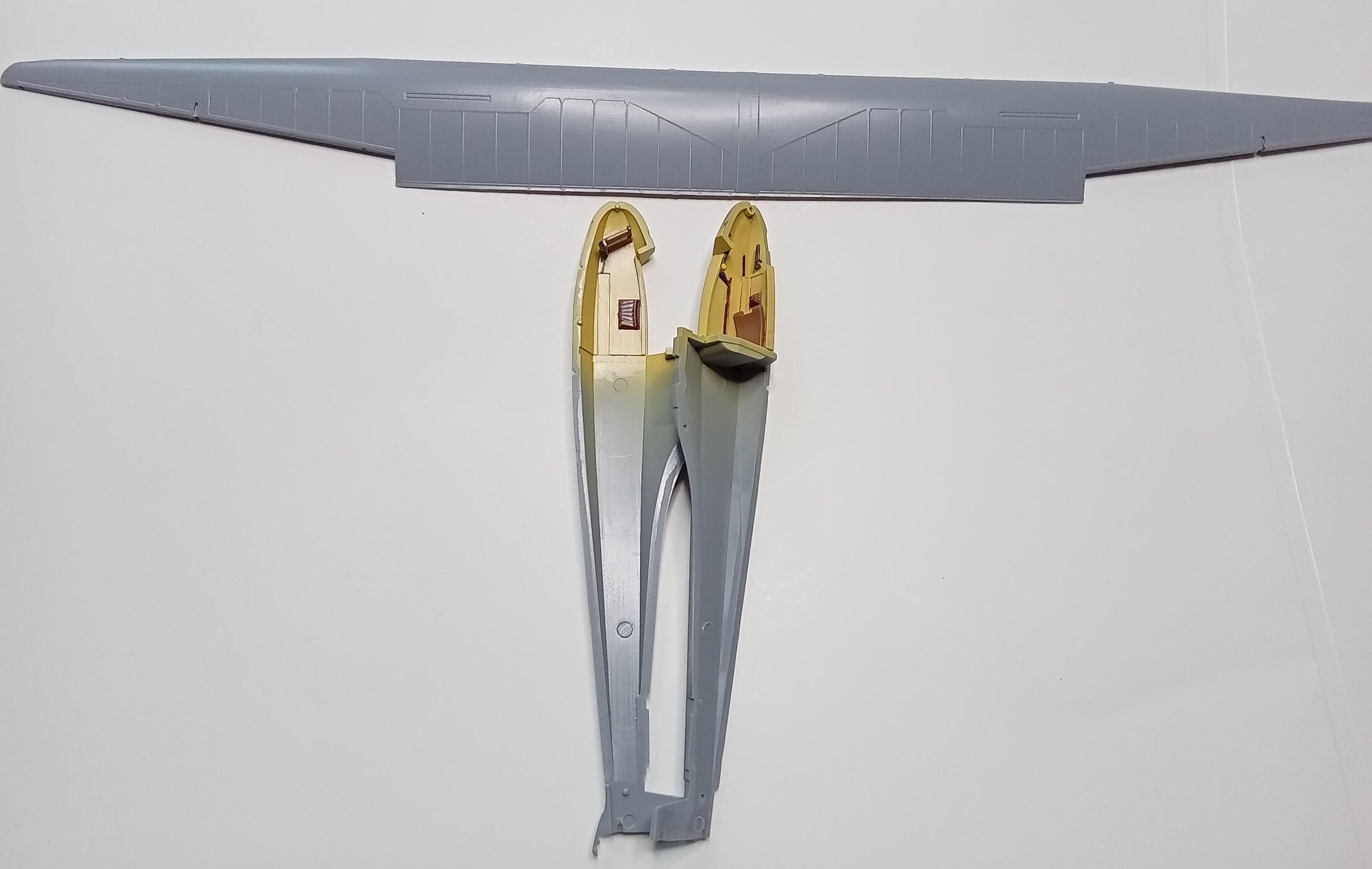Fotky krabky a kamo vypůjčeny z webu SH. Zbarvení je RLM05 Elfenbein. Návod ji míchá z C318 Radome a C4 Yellow. Má představa je nastříkat čistou C318, mezi žebry pak bílou naznačit prosvítání plátna a na závěr "přesmrknout" hodně ředěným mixem dle návodu. Jsem zvědavý, jak to dopadne ...