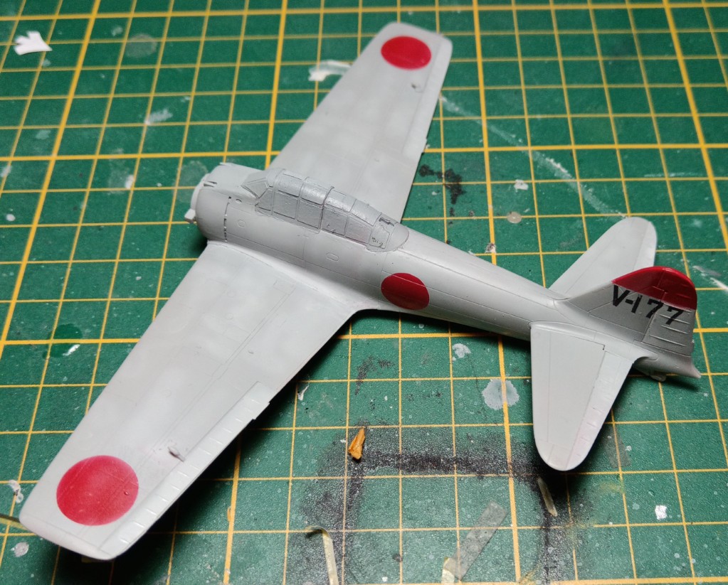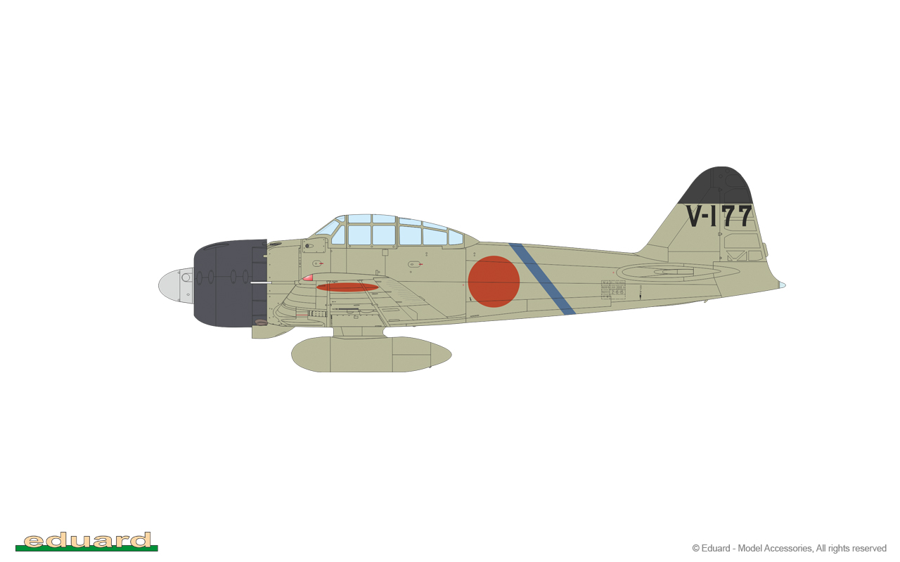 Mohu se zeptat, proč jsi se přiklonil k červenému vršku SOP? Totiž dekály Rising mají vršek červený, Eduard ve své čtvrtce A6M3 Type 32 (82213) černý. V popisu zmiňují i možnost červené, ale pravděpodobnější je podle nich černá. Jen se ptám, zda tedy nemáš ještě další podklad pro potvrzení zbarvení. Modrý šikmý pruh přes trup budeš ještě stříkat?